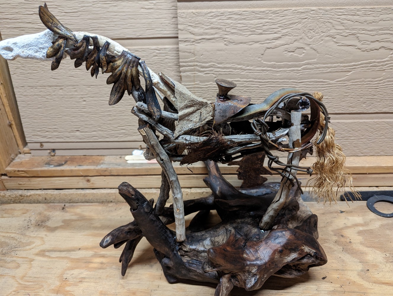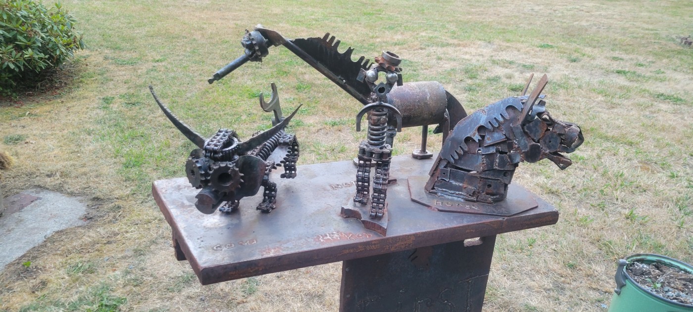 His love for art grew exponentially when his father began working as a garbage truck driver. On days he would drive the truck home for lunch, there would be broken toys and random things hanging from the mirrors and bumpers, and it felt like Christmas! Dan would continually come back to these memories as he collected his items to create his art in the future. After graduating from high school, he would work as a mechanic, where he fell in love with the worn-out gears and sprockets he was replacing. He began welding them in different art forms and looking toward twisted metal and driftwood as further formal inspiration. He purchased himself a second-hand Montgomery Ward hand welder and began crafting his work on larger scales. What started as goods for local craft fairs soon outgrew their stand and Dan needed a larger space to display his work.