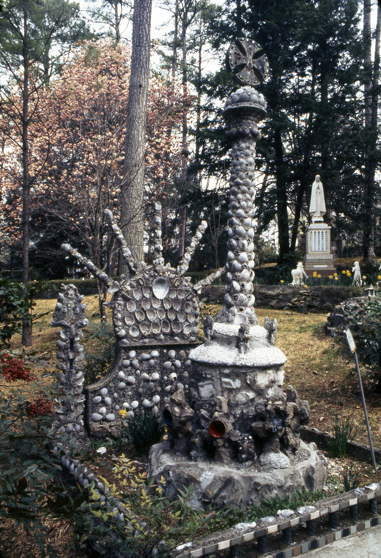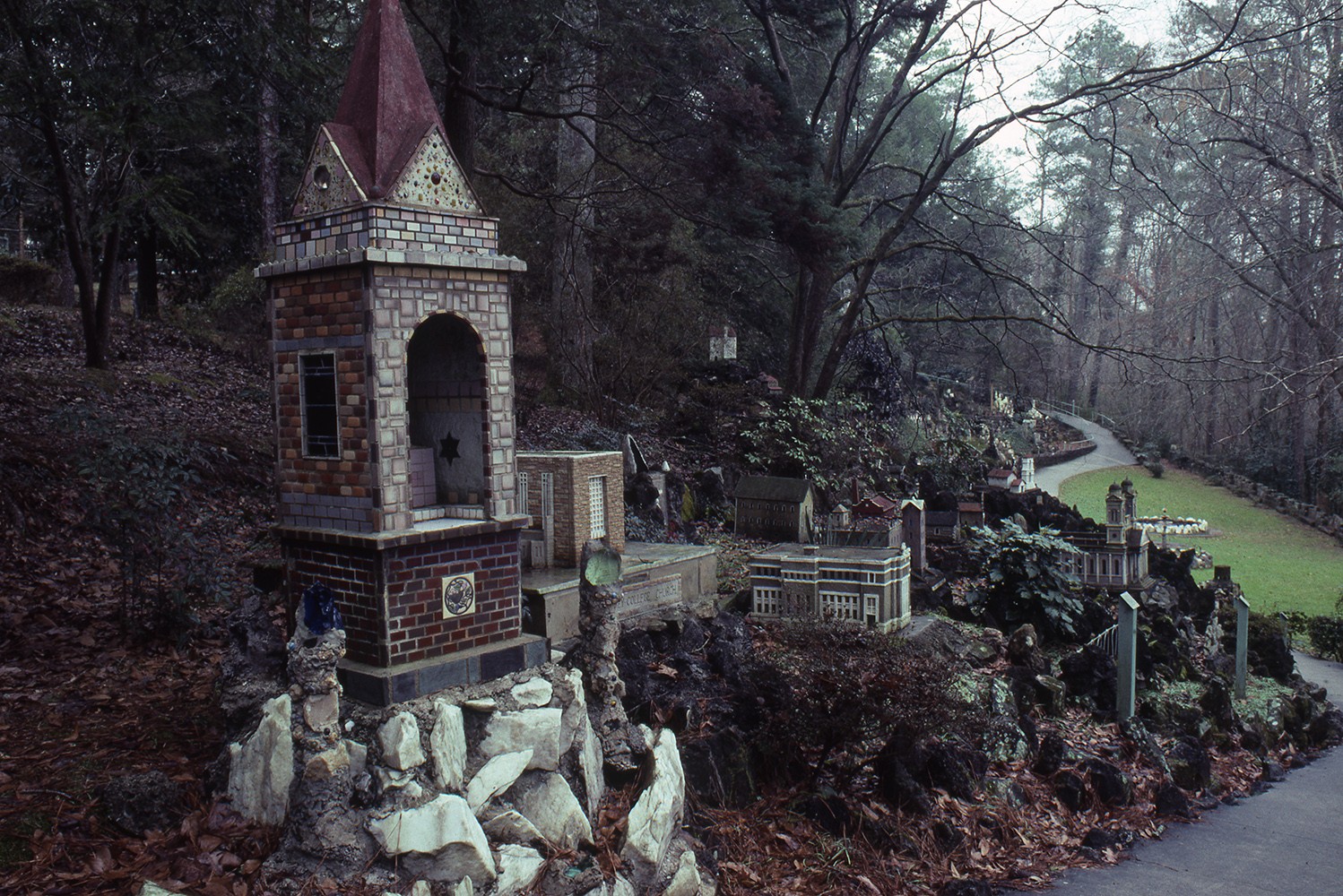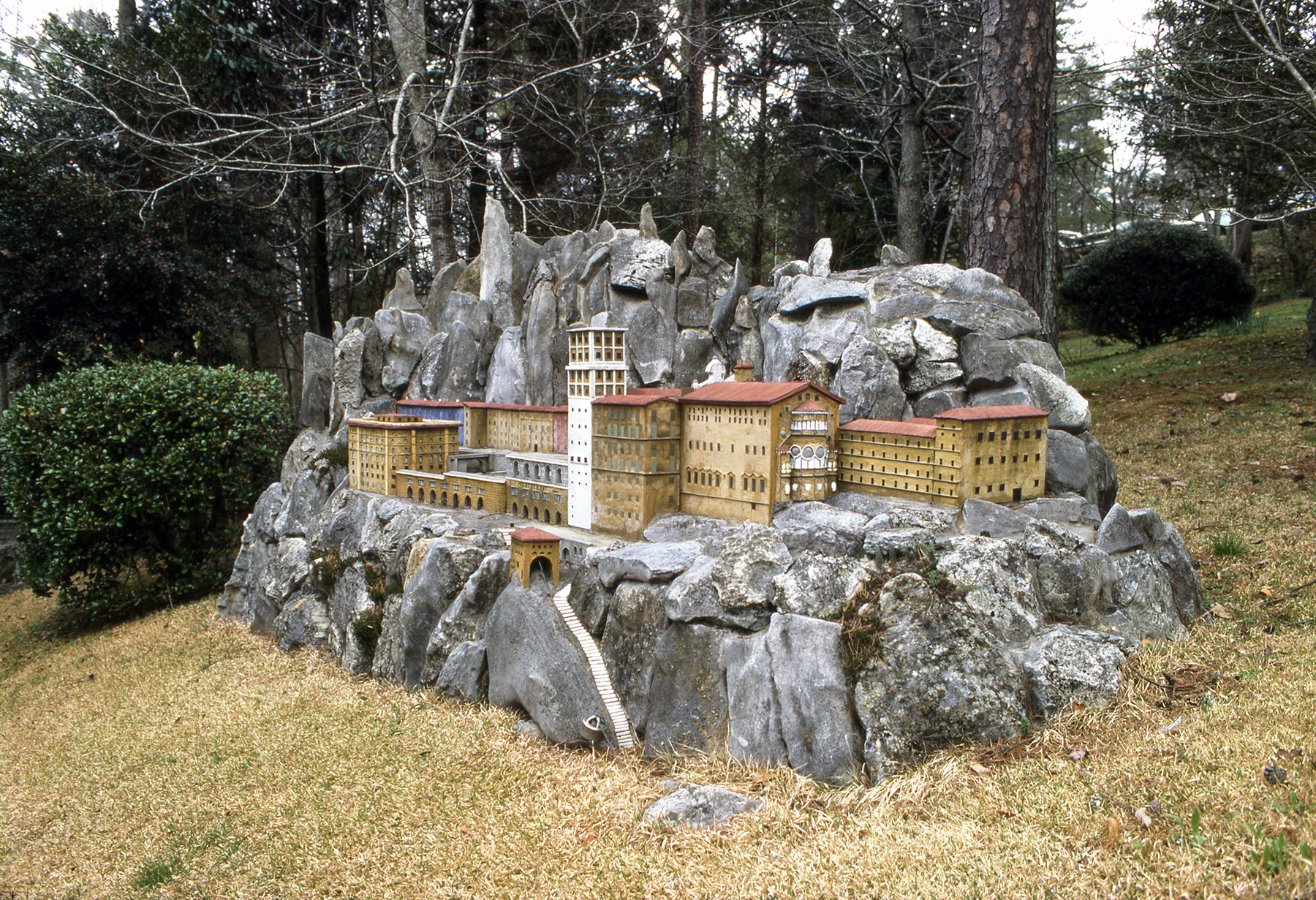 Born in the Bavarian town of Landshut, he joined the Benedictine Order and was recruited for Saint Bernard Abbey, Alabama’s first and only Benedictine Abbey, in 1892. At first he served as a housekeeper for priests in various missions run by the Order, but in 1911 was reassigned to the building of the power plant for the Abbey, a project that lasted for thirty years. He broke up the tedious, backbreaking work by starting to build miniature churches and other buildings as a hobby, later branching out to construct small grottoes to house purchased religious statues for the purpose of raising funds for the Abbey. After making 5000 small grottoes, in 1932 he began construction of the monumental Ave Maria Grotto complex. Although it was dedicated in 1934, it was not completed until 1958, the year of Brother Zoettl’s eightieth birthday. Using cement with found objects and materials sent to him from all over the world, the Ave Maria Grotto includes over 125 miniature reproductions of famous churches, shrines, and other noteworthy buildings, and is spread over a three-acre site. The Grotto remains operated by St. Bernard Abbey and is open to the public.