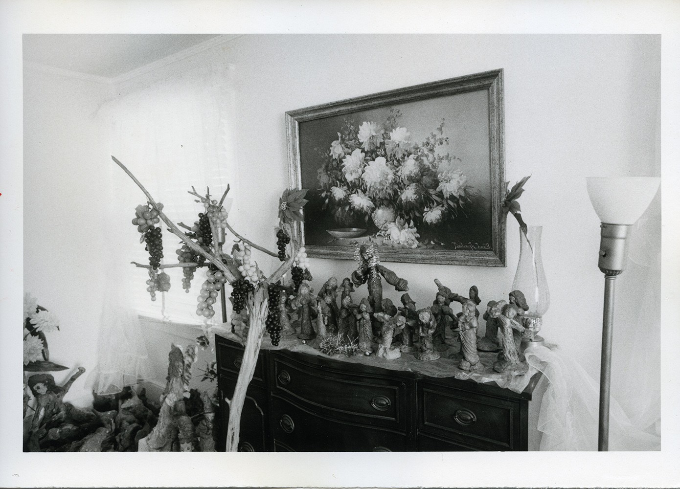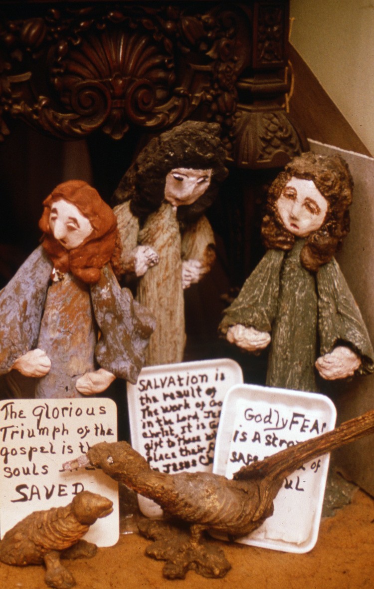 As the community became aware of her work, she led visitors through her home, narrating the scenes as they followed her though a maze of statues. In 1978, her husband John suffered a stroke, and her work came to a halt. She could no longer guide people through the sculptural scenes in her home, so she set up hundreds of signs with instructive messages. She died in 1986, leaving unfinished statues in her workshop – 47 grieving Hebrew mothers. Site is gone, pieces are in collection of North Carolina State University in Raleigh, NC.