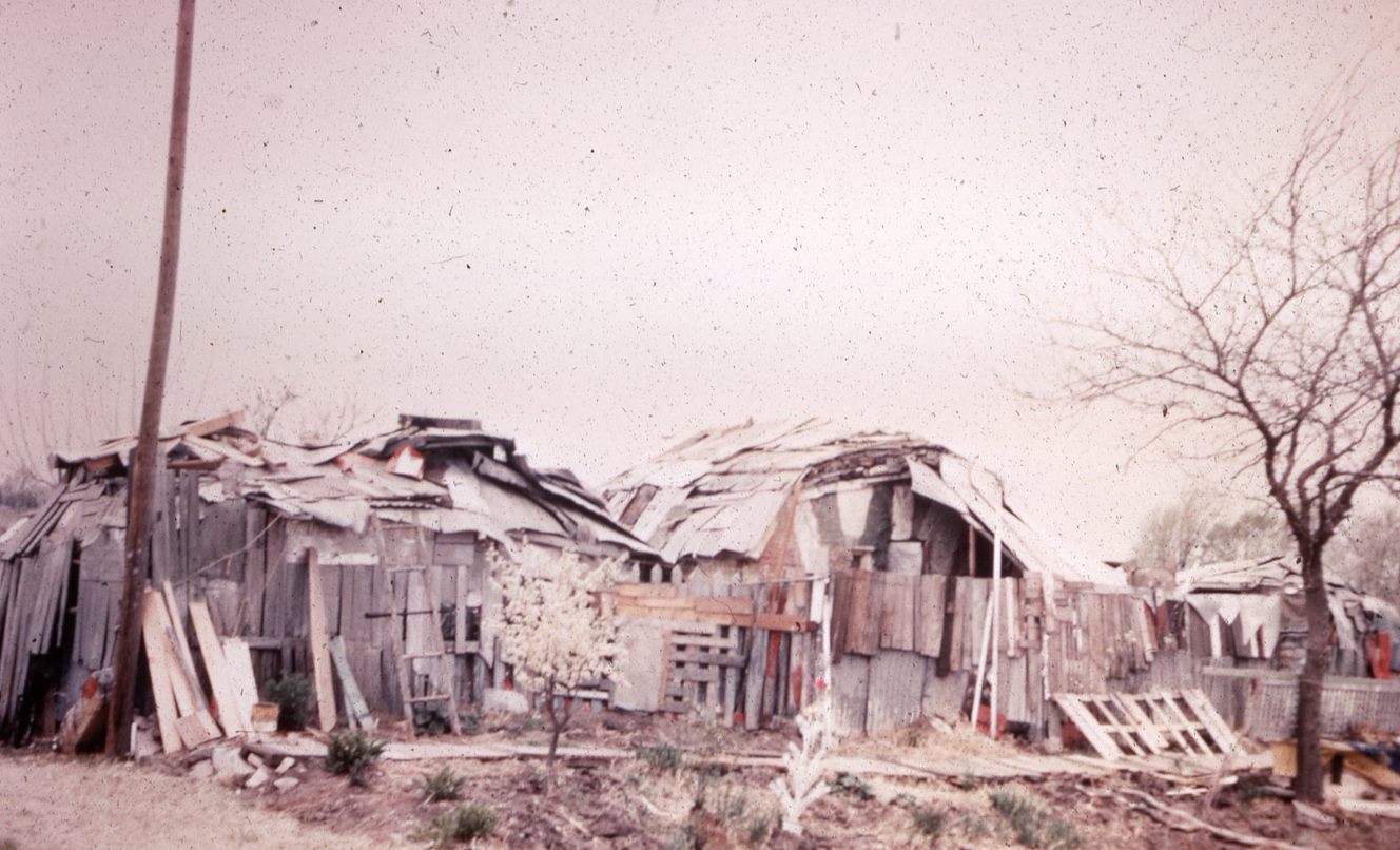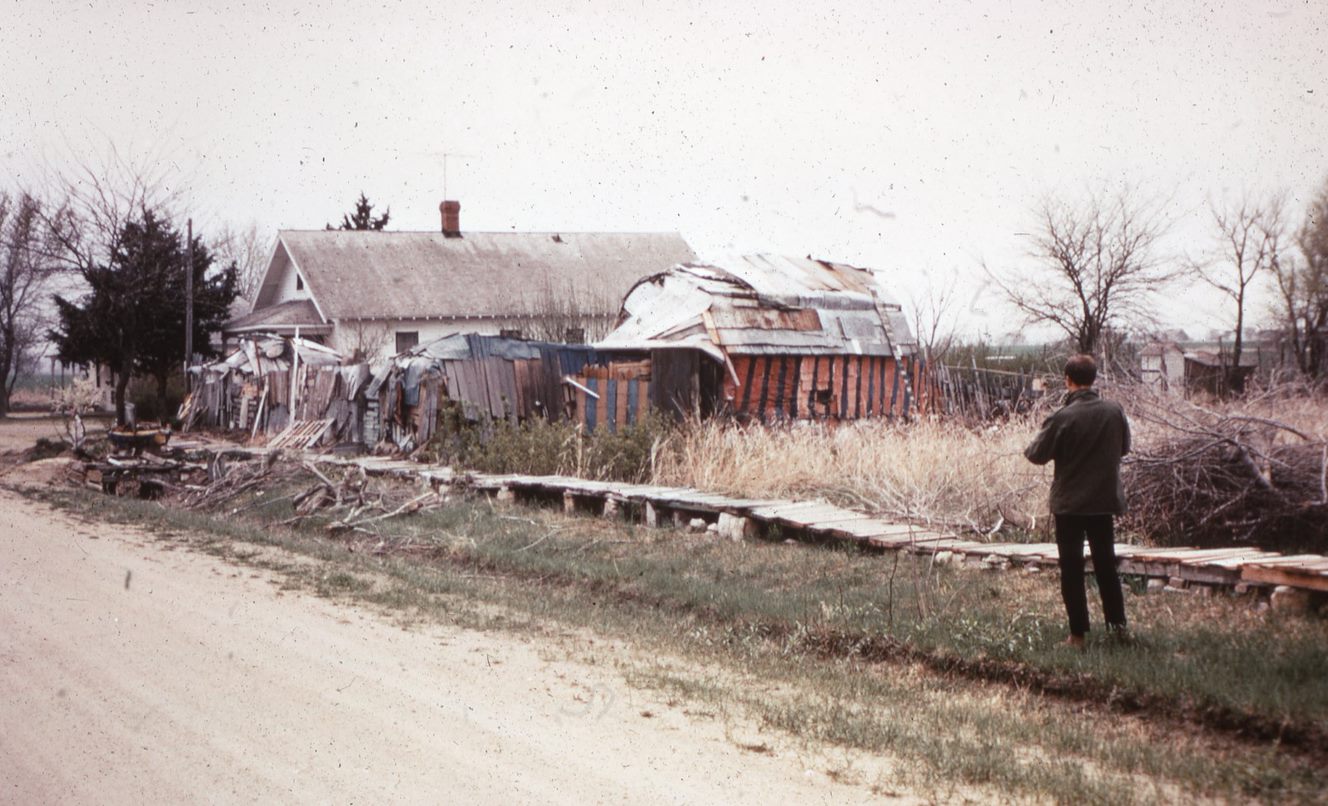 Joe Doughbeck’s “buildings of junk” were constructed over an unknown number of years on a small plot of land at the edge of Wilson, Kansas, a farm town only twenty miles from the art environments of S.P. Dinsmoor and Ed Root. Doughbeck was born in 1883 and served in the United States Army in his adult years. Upon his return, he built at least three structures (a house and two sheds), a walkway, and a decorative fence from salvaged materials, including sheets of tin, wooden boards, fluorescent light bulbs, discarded Christmas trees, plastic flowers, and old sewing machine legs. Along the fence and exterior of the house, Doughbeck painted alternating vertical stripes in blue and red-orange. On one side of the fence, he displayed a figure cut from tar paper which was decorated with silver paint and aluminum foil. In order to have “roll-down windows” in the walls of his house, Doughbeck repurposed salvaged car doors and incorporated them into the building’s structure. Due to the particularity of his home within the community of Wilson, Doughbeck suffered physical attacks and property vandalism regularly. As a Mennonite in a largely Catholic community, Doughbeck felt persecuted for his faith; in his attempts to do research on Doughbeck for his Master’s thesis at Cornell, art historian and artist Gregg Blasdel records having great difficulty gleaning information about Doughbeck from neighbors, and notes that the artist spoke fervently against the “fish-eaters” (Catholics) in his community. Upon Doughbeck’s death in 1964, his buildings were razed.