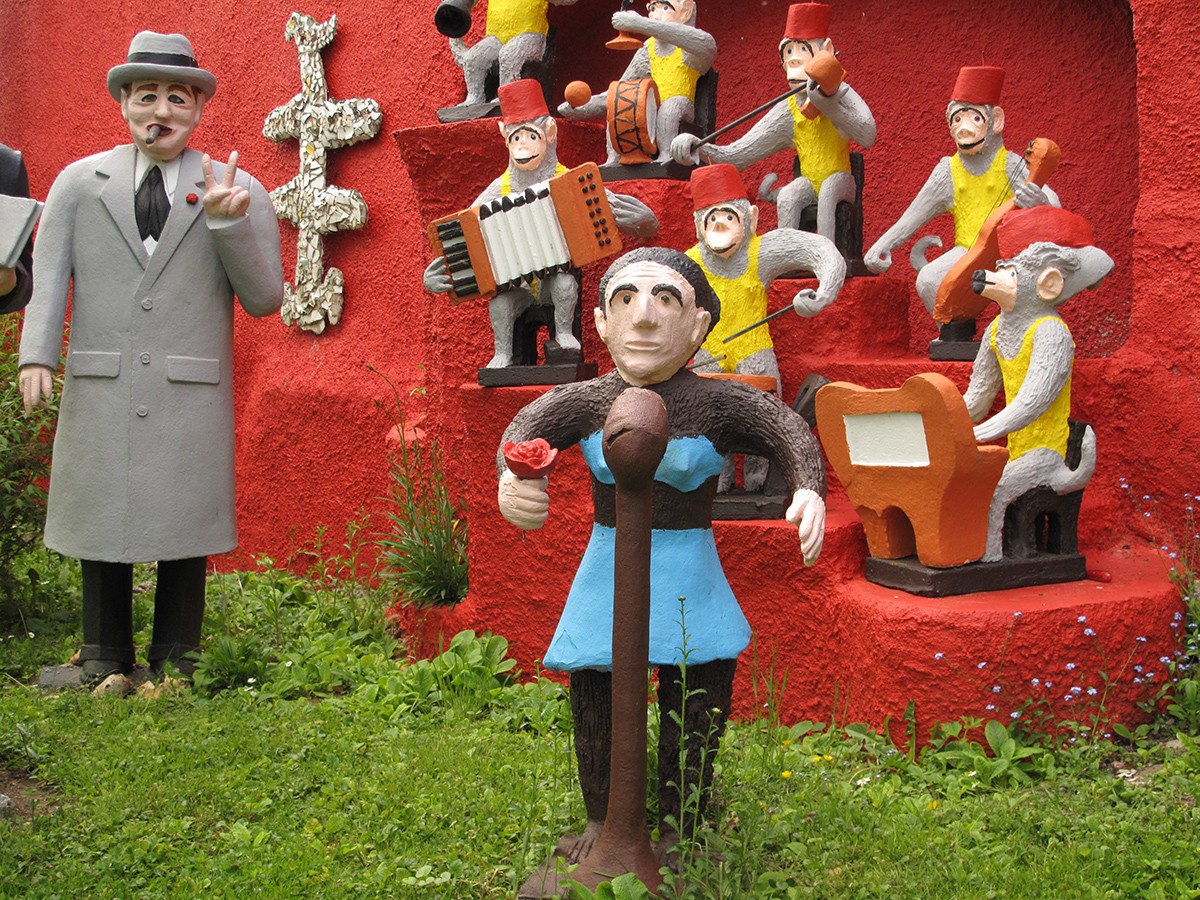 Although not much is known about Vidal’s early life, it is known that he lived in Béziers in the south of France, where he was a mason and also worked with cement. After his retirement in 1955, he moved to nearby Agde and began building figurative sculptures out of reinforced concrete that he installed in the garden around his home. It is estimated that he created some 150 figures, including apocryphal characters like Adam and Eve; world leaders, including Winston Churchill; and famous performers, including Jayne Mansfield, Georges Clemenceau, and Fernandel. Unidentified figures, including swimmers, and dogs, were also part of his oeuvre. Many works are humorous, reflecting, it is said, the spirit of their creator, and many were identified with inscriptions on their bodies, like a comic strip.