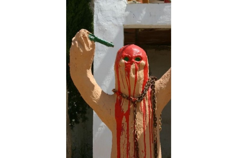 At least partially in response to these killings, Basanta began ornamenting his castillicos with roughly made “gods” and “demons.” Human-scaled or greater in size, leaning imposingly toward viewers, the brightly-painted ghouls, soldiers, and skeletons vie for prominence with religious figures and scenes, including Jesus with his executioners. Working alone, Basanta has changed the site with great regularity, rearranging groupings and adding new figures and paint colors.