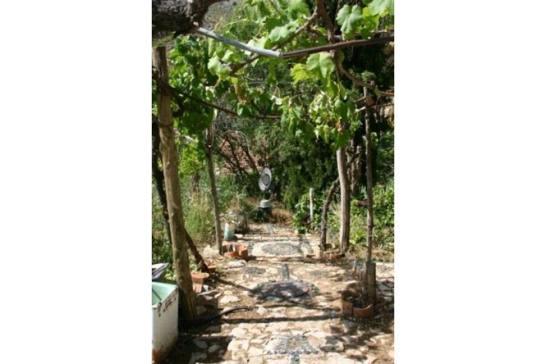 After his “retirement” Tío Cesáreo continued to creatively think about finding solutions to the daily issues that would arise in the village. One seemingly innocuous domestic problem turned out to have a long-term solution that went far beyond the original concern: because his home was right on the road, his chickens would sometimes venture too far away from their corral and would get run over in the traffic. He therefore decided to take them up the hill to a small property that he owned at the end of town, building an enclosure to keep them safe, but where they could still roam and feed. That hilly terrain was rocky, generally unsuitable for growing produce, but once he had his poultry there, he planted some trees, and, as it was slightly remote, he decided that while he was there he would decorate the area, using materials that he found at the dump or that people threw away. His materials of choice were green wine or beer bottles, which he inlaid into the ground in floral and abstract forms.