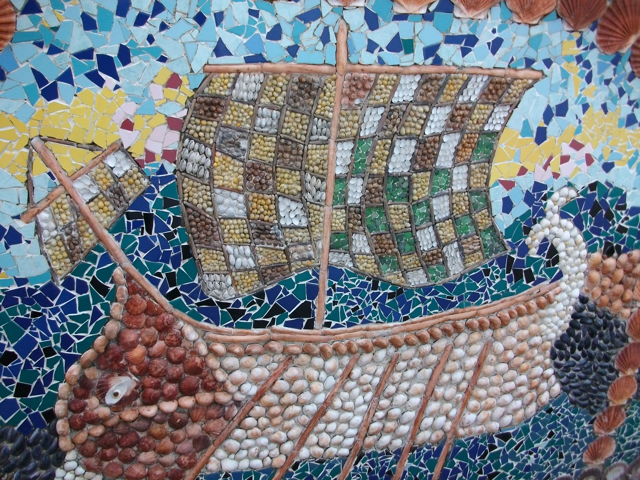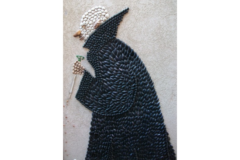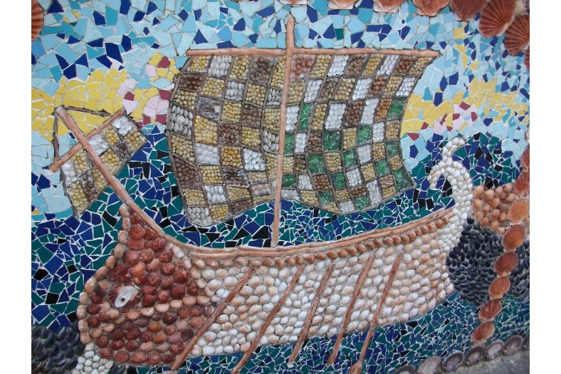 Among the figures are those of the god Neptune with his trident, Ulysses with the sirens who called to him, and Nosferatu. There is also a varied bestiary complete with seagulls, bats, and owls, as well as a phoenix, a toucan, a cat, a butterfly, a frog, a seahorse, fish, dolphins, and an octopus. There are also flowers, suns, ships, lighthouses, and beautiful framed paintings. The work is colorful and uses all kinds of shells.