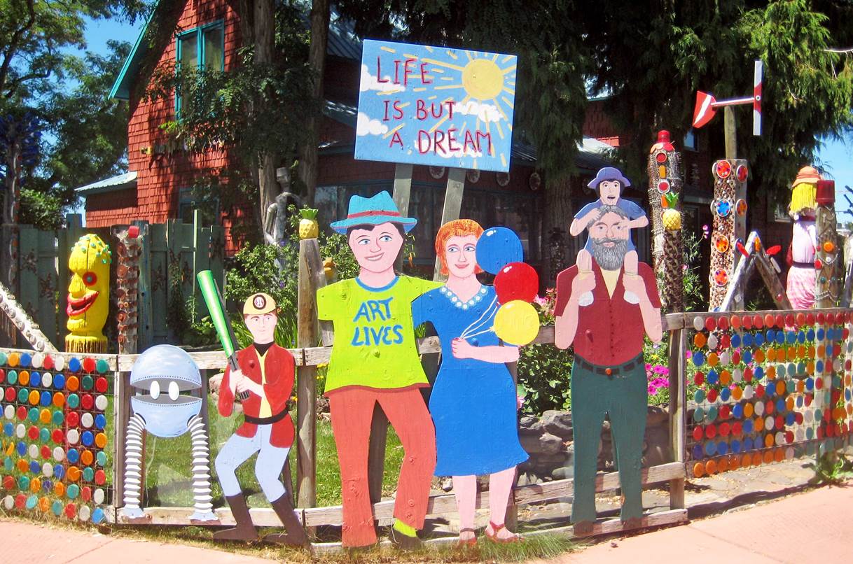 The bottle caps, reflectors, hub caps, and paintings are installed on the façades of the buildings, on the perimeter fences, and in the yards. They are intermingled with glass insulators, buckles, chains, keys, and other small hardware; paths wind their way through the property – some are painted, and others “paved” with mosaics of pebbles, tiles, and found objects. Figures may include nudes, Uncle Sam (who morphed over time into Aunt Sammy), robots, aliens, animals, and more. Totems and lawn ornaments mesh with the other abstract and figurative elements in a colorful and grand array. The site has been well documented in print media, television, and film, and the art collection, in total, will be bequeathed to the Yakima Valley Museum.