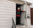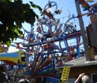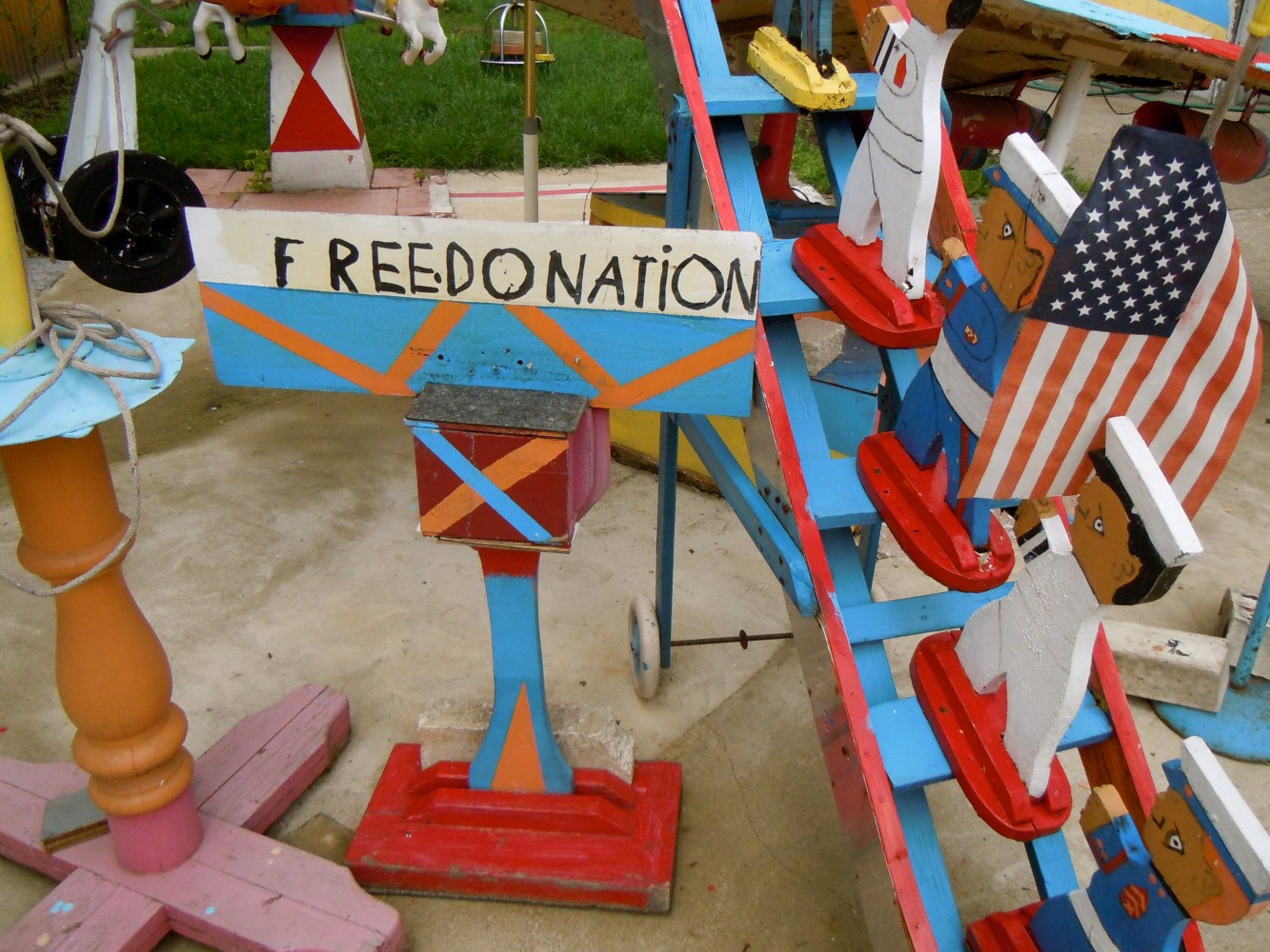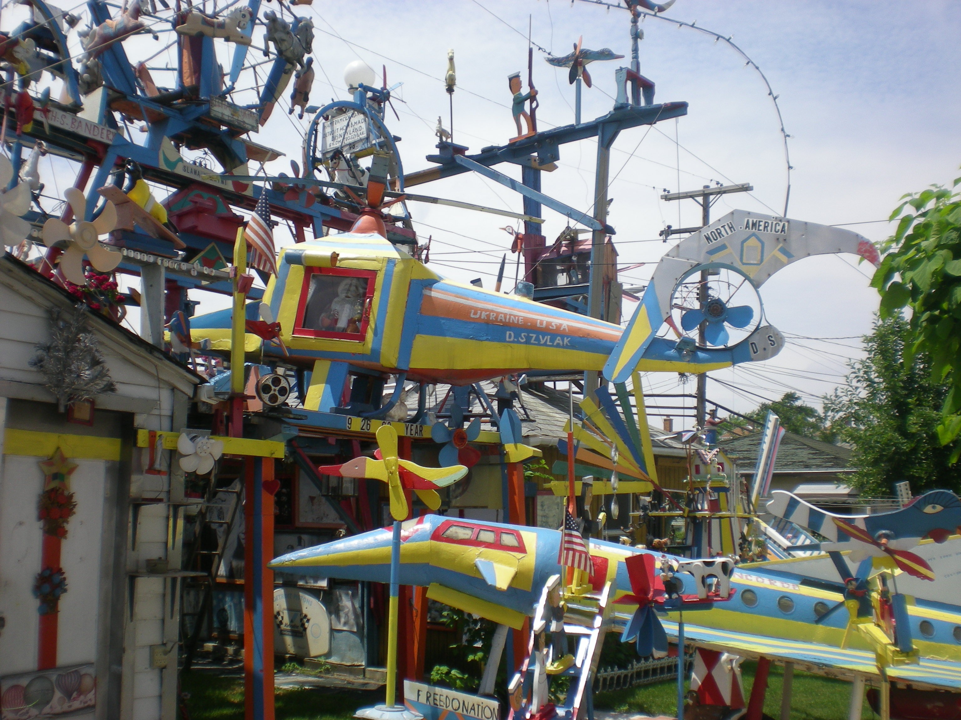 The installation included wooden cutouts as well as spinning fans and whirligigs. All were brightly painted – many in the orange, yellow and blue of his homeland’s symbols – and included images of figures (including the Statue of Liberty, complete with torch) as well as rockets and animals. Elvis, Disneyland characters, other pop culture stars, wooden soldiers with wooden guns, and more adorned the site, most lit up with Christmas lights that shone year-round. The figures were fastened to wooden beams that reached two stories high. Tin sheets, light bulbs, a giant homemade jet aircraft with Santa Claus as the pilot, and found objects including plastic rocking horses, fan propellers, and other materials were juxtaposed with and enhanced the cutout wooden figures. There are landscape paintings and hand-painted signs, and hidden speakers would play Ukrainian music when Szylak so desired. Stretching in front of, to the side of, and on top of his modest home and adjacent garages, they dwarfed it with exuberance, color, and – when powered on – movement.
