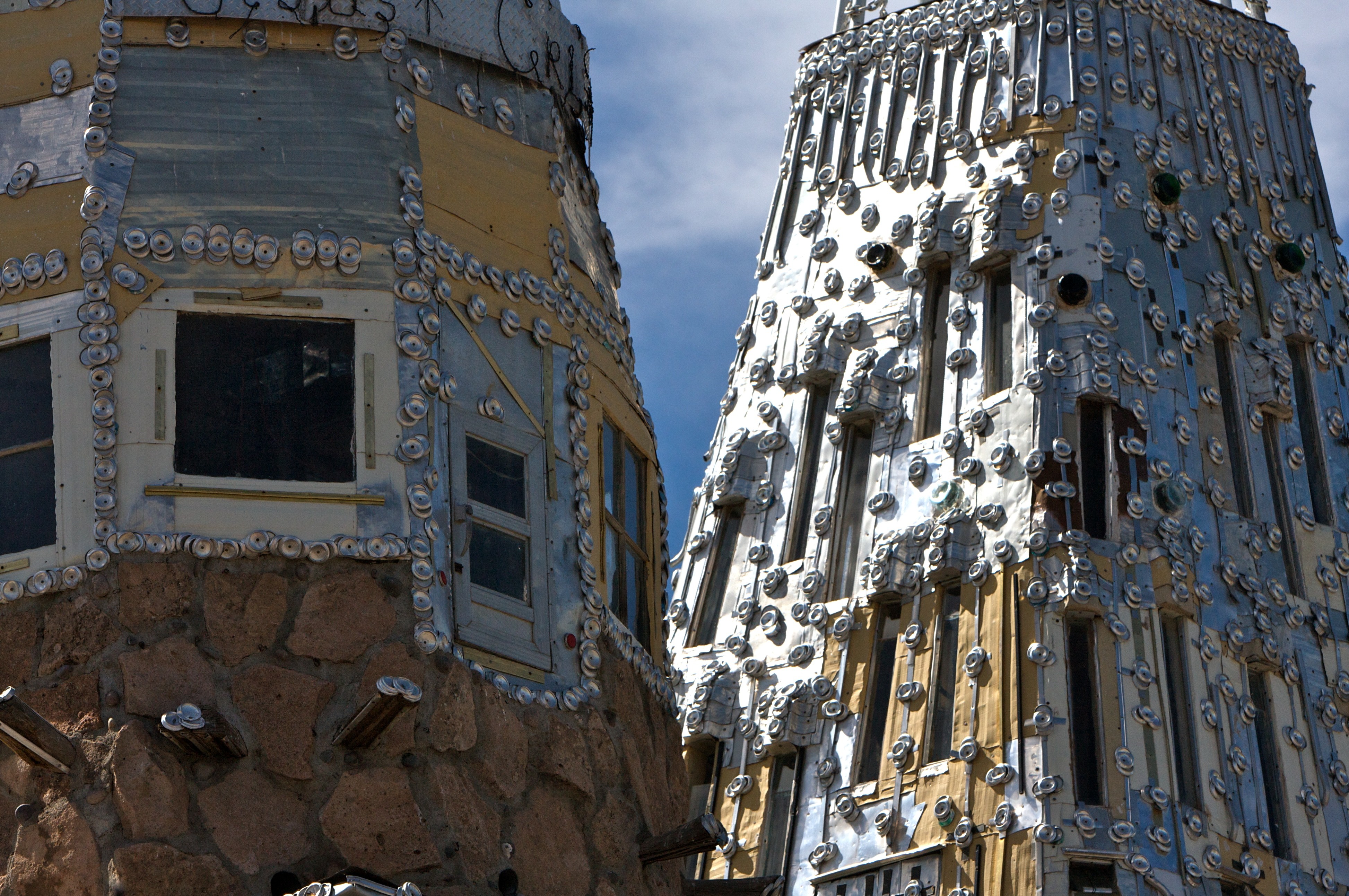 Like many veterans, Espinoza reveals few war memories, but does speak of his best foot-soldier friend being killed with “one month left in country,” shortly before he himself was discharged. He also speaks of “being fascinated” by the [Buddhist] temples he saw in Vietnam, and later thought of building his own castle as “my way of building something for our religion.” Upon his return from Vietnam, he used scavenged materials to improve his new house in Conejos, and taught himself construction skills. Yet a glistening roof-covering of flattened aluminum cans did not prevent it from burning down. Suspiciously, in his view, Espinoza was away when the fire started, and reports were that firemen with dry hoses stood back while bullets popped-off inside “like firecrackers” and allowed his home to be consumed. Shaken by the house fire and convinced that his recent “heist” inquiries had invited arson, Espinoza decided to rebuild the primary structures out of stone “inside and outside,” and says that the (regal) pink volcanic rock he brought back from New Mexico “almost forced [him] to build a castle.” Wooden members are sheathed in sheets of applied metal scrap, and the hundreds of cut-off aluminum can bottoms are now decorative embellishments to the underlying flame-retardant surfaces. He refers to the castle as a “sanctuary” structure; widespread anxieties over “Y2K” persuaded him to have it mostly finished ahead of the new century.