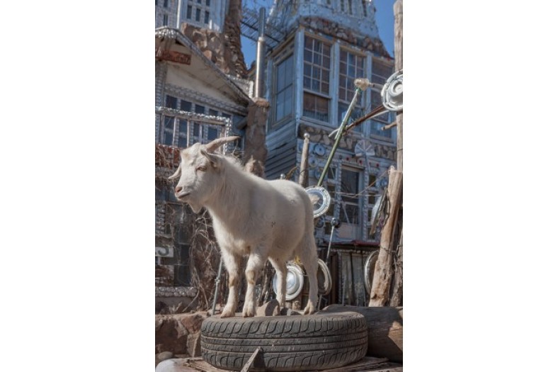 Espinoza doesn’t own a car, phone or “icebox,” and would bicycle to the grocery store when his garden couldn’t provide fresh food. He believes in the homeopathic use of the aloe vera plant to prevent and cure cancers, doesn’t see doctors, and is convinced that most bodily ills come from unnatural or contaminated foods and minds. In front of the castle wall two large “arrows from heaven” carry the messages: “ALCOHOL + TOBACOO IS KILLS” and “MARYJANE IS HEALING.” Undiminished by English misspellings, a rectangular board resembling a target with blue concentric circles around a small red center circle hangs from a chain between the arrows and symbolizes his message: “pureness of heart-- keeping away from addiction.” Nearby, empty liquor bottles displayed on a raised plank under a weathered “SALOON” sign evoke the “effects of alcohol and the people it destroyed.” Behind it, and still outside the castle walls, more empty liquor bottles are interspersed with pointed metal skewers around another found sign: “HELiSPOT.” Calling himself “a survivor” Cano believes that the rare “ring-tailed deer” he sometimes sees around the castle at dusk are “my angels looking after me.”