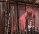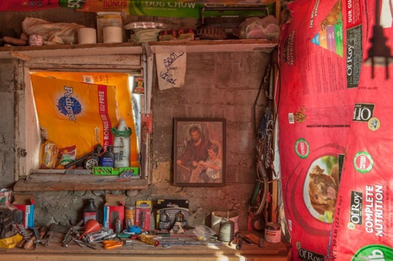 Espinoza embedded his chain-link perimeter fence into the same orange rocks he brought back from the desert to build the castle. Now inside castle walls, his corner house is to the left as visitors enter through an arched rebar, aluminum-plated gateway, and the castle fills out the block-wide lot to a dirt alleyway on the right. Using ropes, he is able to climb up inside, but the castle structures have few floors and are not inhabitable: it is more shrine than building. Wire letters under a protective overhang toward the center of the King read La Virgen De Guadalupe; pervasive in Hispanic Catholic culture, the vision of the Virgin Mary standing on a black crescent moon surrounded by emanating rays is a sanctioned miracle in the acheiropoietic tradition, first appearing inside the peasant boy Juan Diego’s cloak full of flowers after he witnessed glowing apparitions of Mary near Mexico City in 1531. Espinoza frequently places fresh flowers near his several Mary figurines— including a concrete Virgin of Guadalupe sculpture enshrined in a vertical bathtub across from the castle.
