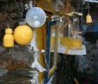 In addition, terrified of losing his home as a result of an imagined bureaucratic snafu, he painted a myriad of distinguishing numbers on all of its façades to identify it so that no one would mistake his home for another. Painterly and enigmatic, these symbols developed into a type of personal codex, and he soon began to extend them to a wider area, painting them on the streets on both sides of his house, as well as on municipal benches, light posts, the nearby highway, and more. He also fabricated elaborate constructions made from tin cans, plastic bottles, pieces of glass, and mirrors to adorn the rooftop of his home and the corners of his land, functioning as defensive apotropaic devices to keep people away and protect his property.