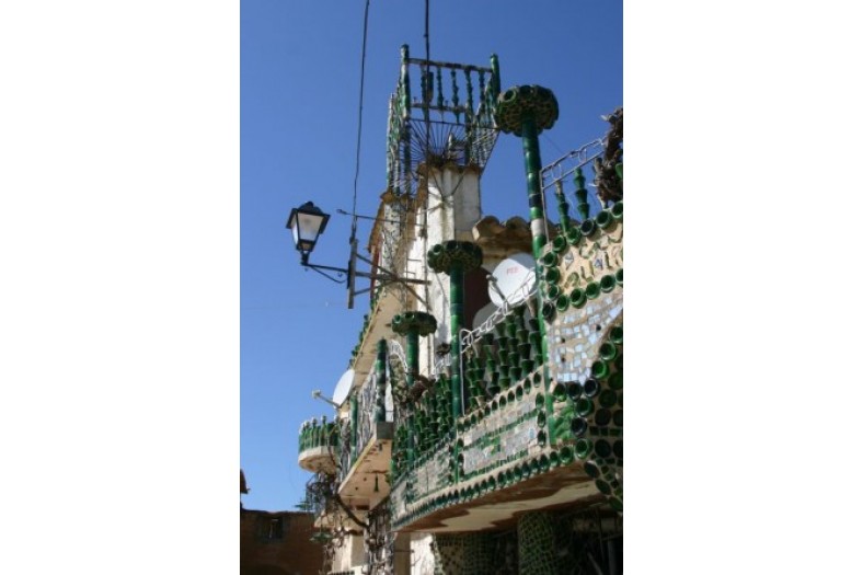 The approximately one hundred inhabitants of Monesma make their living from agricultural crops such as wheat, as well as from raising cattle. The village is so small that it shares a mayor and municipal offices with four other surrounding hamlets. Into this small community Félix Sanpériz, also known as Feliz, was born to a family of subsistence farmers, one of three children; all of them have since moved away. Félix was known as a bohemian and around 1989 he began fixing up the house in which he was born, a modest two-story whitewashed house overlooking the Val de Alferche plaza. At that time there was a bar on this plaza, and he began collecting their empty green glass bottles that held cava [Spanish sparkling wine], with the idea that he could use them to ornament his house and garden. Sanpériz was not a big drinker, so other people would also save their bottles and give them to him. The cava bottles tend to be thicker than conventional wine and beer bottles because of the need to contain the pressurized sparkling wine; when empty, the bottles are therefore more durable and serve better as a building material. It is said that Sanpériz thought perhaps one day he would open a restaurant in his house.
