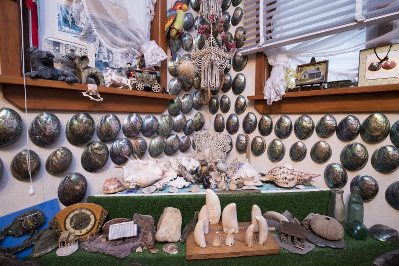 Pāua– the Māori name for the beautiful Haliotis Iris snails – are plentiful in the shallow waters off the coast, and are prized not only for their delicious flesh but for the shiny iridescent colors of their large shells, which are used by jewelers and collected by tourists. And so Fred gathered the shells, with the intent to sell them if possible. However, it was hard for him to sell as many as he collected, so he brought them home, and he and his wife Myrtle stacked them in their living room.