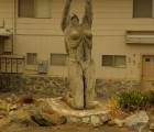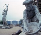 Completely self-taught, Fox began building his sculptures in the late 1960s, and explored a range of subject matter. In addition to the somewhat allegorical male and female nude figures, there are also two iconic figures that represent the building of the old west. The first is a Chinese “coolie” pushing a wheelbarrow, built in 1972 from one mile of reinforced steel and 35 cubic yards of concrete; it rises 22 feet tall, is 33 feet long, and weighs 70 tons. It was relocated in 1989 from Fox’s parking lot to a memorial area near the old train depot and the Chamber of Commerce that also includes a caboose representing the presence and importance of the building of the train system. On the Chinese Coolie statue is a plaque that notes that Fox described the statue as “a tribute to the historical significance of the Chinese worker in the construction of the Transcontinental Railroad through the Sierra Mountains of California.” A second outlying work is a monumental gold prospector, specifically Claude Chana (1811-1882), who is credited with discovering the first gold rock here in the foothills of the Sierra on May 16, 1848, which then spurred the great gold rush in what is now known as California’s Gold Country. The sculpture of Chana panning for gold was created, like the others, out of a rebar and wire mesh infrastructure and then covered in concrete mortar. It weighs 45 tons.