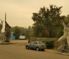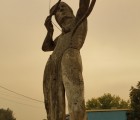 A series of concrete statues were constructed by dentist Dr. Kenneth Fox in the outdoor studio located behind his dentistry practice in a somewhat out-of-the-way and woodsy area of Auburn, California, east of Sacramento in the foothills of the Sierra Nevada mountains. The sculptures range in size, with some significantly smaller than life size, such as the lounging female nude located just outside of the fenced-in studio area. Fox’s fame, however, has come from the monumentality of other works, particularly the Amazon Archer, which rises 42 feet tall and weighs over 120 tons.