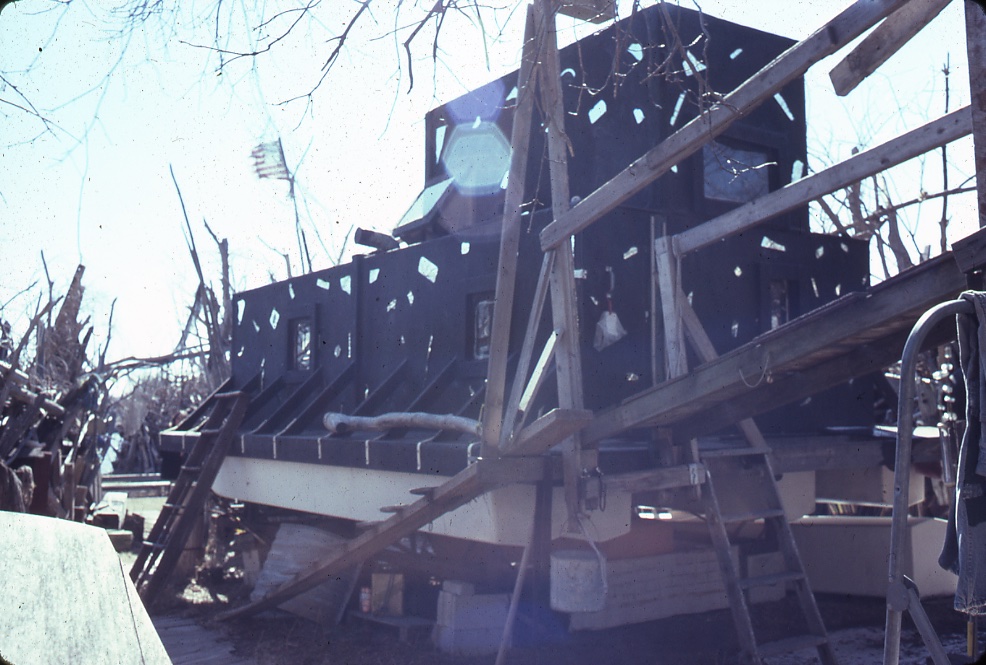 When Schneider was young, he scaled tall buildings and other structures while working as a steeplejack. A bad fall from an outdoor movie platform in 1972 when he was 25 left him permanently disabled. He began combing the local beach for driftwood and other washed up or cast off items which eventually became the building material for Homeboat – a carefully planned structure erected on a short street adjacent to (but not directly on) the Sheboygan River.