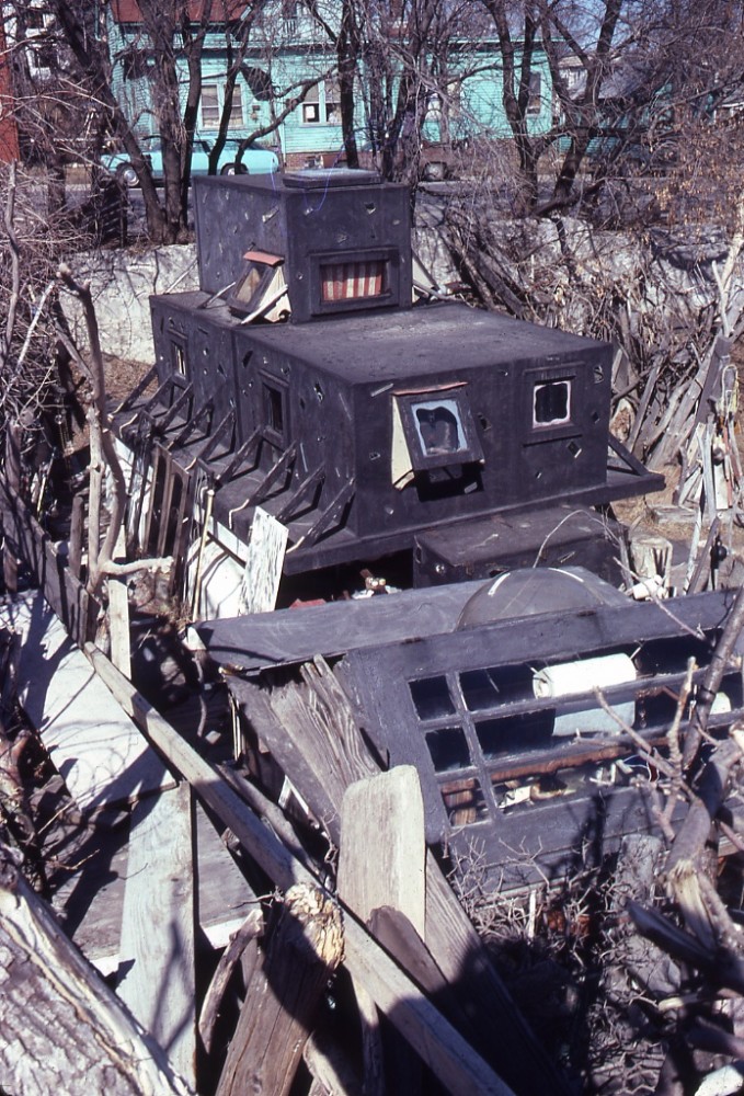 In the summer of 1980, the City of Sheboygan decided it would no longer tolerate Schneider’s public installation and planned for its demolition. The public rallied around the work as did the local arts institution the John Michael Kohler Arts Center, going as far as convincing the Kohler Foundation to fund an attorney to represent the newly formed “Friends of Jim Schneider’s Sculpture” group. The Friends fought with the City for nearly a year; in the end, the local court ruled that the site would be razed due to building code violations. The day the work was taken down, Schneider was seen fashioning a small cross from scrap wood to place at the site as a memorial to his former home.