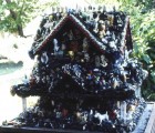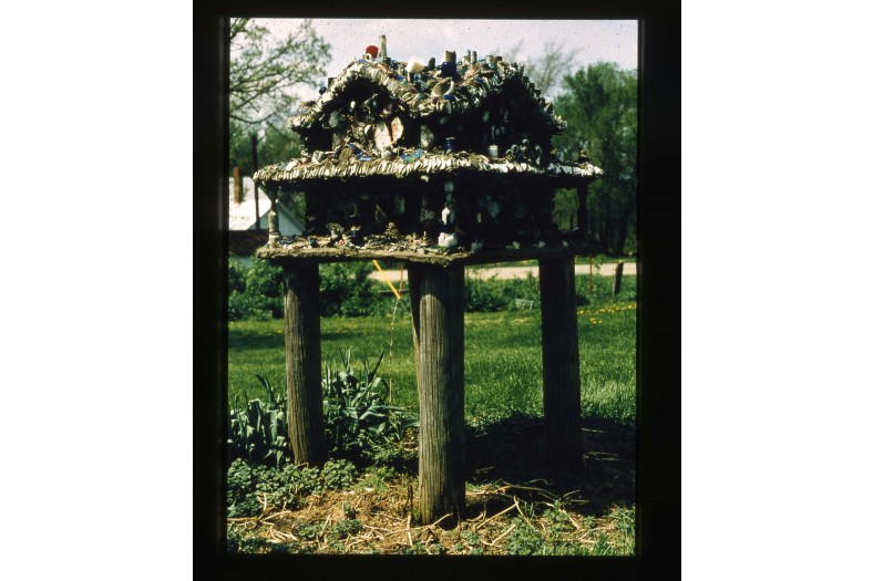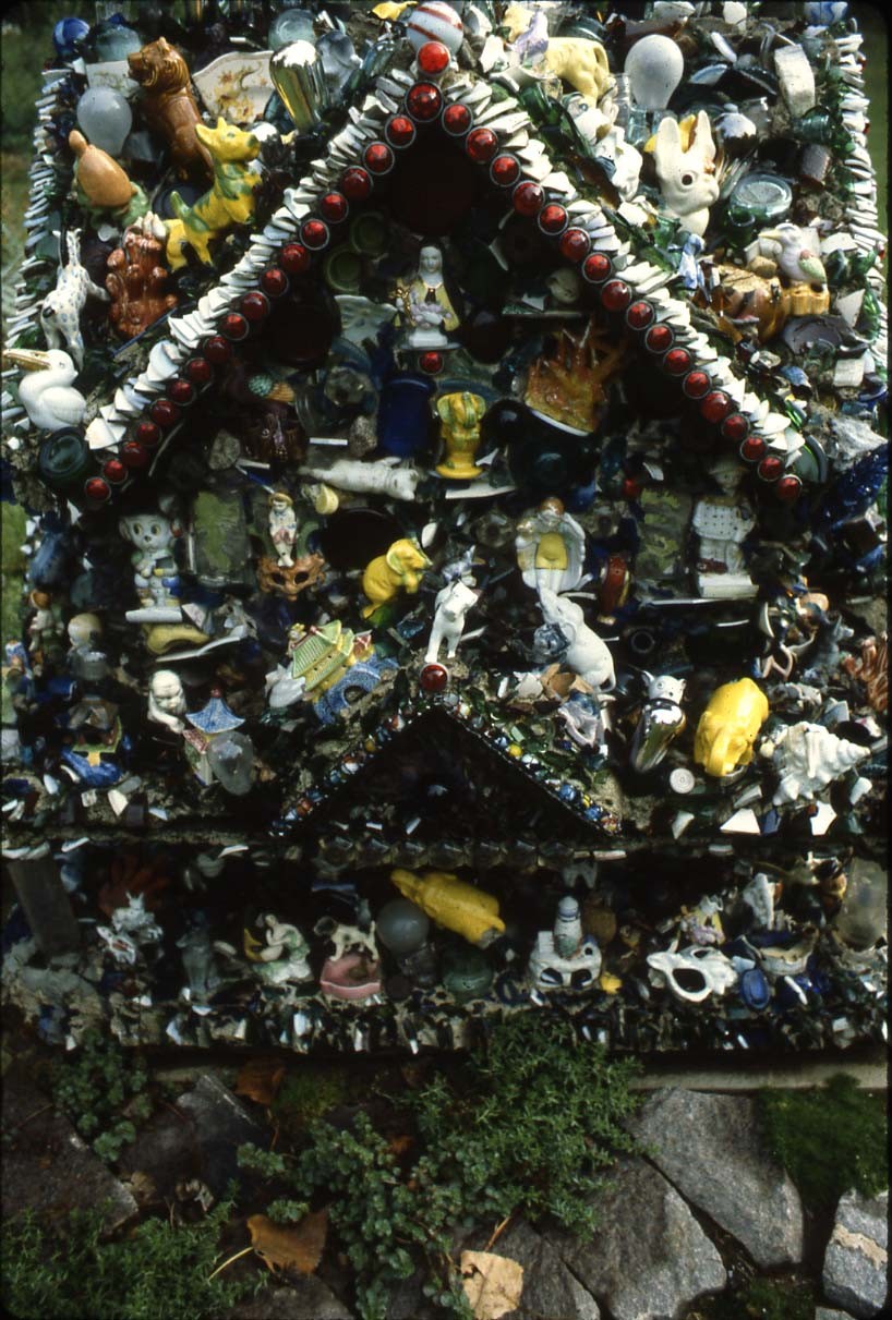 The Victorian period had broken up by the 1920s, but the objects remained. Baker made good use of the cultural leftovers. One of his cross-gabled houses, no more than four feet in any dimension, contains the china souvenirs of a lifetime, perhaps several. The structure is dense with tiny figurines: a Virgin Mary appears in each pediment and again in unexpected places; watchdogs bark at camels and cockatoos; cats clutch at the rooftop. Pagodas stick out everywhere. This house had graced the lobby of the DeSoto House Hotel in Galena, Illinois for some years and was in two locations in Elizabeth, Illinois, from the early 1970s to 1993, when it was moved to a private collection in Wisconsin. It was gifted to the John Michael Kohler Arts Center, Sheboygan, Wis. in 2006. After a complete restoration it was added to the Art Center’s permanent collection.