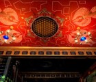 He spent a year working in the unheated/non-air conditioned building, craning his neck while working on rickety scaffolding, creating large-scale murals for the walls and ceilings free-hand, mixing styles and motifs as inspiration hit him. Some sections draw on well-known paintings, such as those by Michelangelo for the Sistine Chapel, while others feature such varying imagery as penguins, a sumo wrestler, and surreal landscapes. Figures from popular culture, history, and legend – from Star Wars characters to Julius Caesar and Jesus Christ – also served as inspiration, as did motifs drawn from Japanese calligraphy, Egyptian hieroglyphics, and the paintings of Van Gogh. Urban graffiti, Tibetan meditative symbols, and occasional narrative phrases punctuate the colorful surfaces.