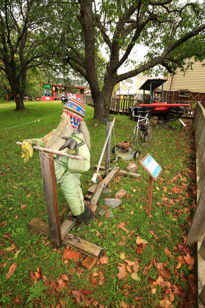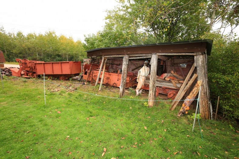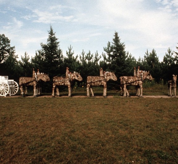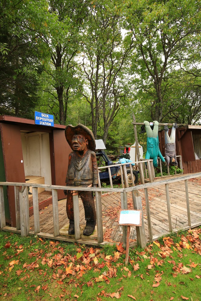 Beyond the kitschy tourist displays are a series of sculptures made from found objects. A car sawed in half is painted in the colors of the Finnish flag and made into a love seat; a bird is created from garden implements; a yellow oil barrow serves as the body of a coyote-like creature. There is Big Gus, the 23-foot-long world’s largest working chainsaw; Big Ernie, at 35 feet long the world’s largest working rifle; Gravel Gertie, the largest motorized tricycle in Michigan (and maybe the world!); these, along with wacky vehicles bolted together from a variety of junked auto parts – including the “Yooper Assault Vehicle,” with a straw-stuffed mannequin sporting a helmet ornamented with deer antlers – are described by DeCaire as “Yoopervations,” idiosyncratic one-offs built on a base of financial necessity and the creativity that comes with imposed time indoors resulting from extended periods of inclement weather. A selection of chainsaw sculptures by local artist George Barasko also appears on the property.