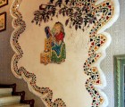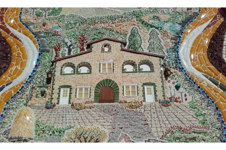 At the beginning Díaz had no thought of decorating his new house, although being so close to Barcelona – and given his architectural training – he certainly knew, and greatly admired, the work of the Catalan Modernist master Antoni Gaudí. But he tentatively began thinking about adding color and texture to his home, and started with a mural on the interior of a perimeter wall, using only the natural rocks and stones of the surroundings, composing a stylized image of a couple set against a natural backdrop. Soon, however, he was ready for color, and has created a series of increasingly complex mosaic murals on both the interior and exterior of his home. He focuses his imagery on the biographical, the local, and the apocryphal, and while there are numerous images of local towns and their traditions, monuments, and the natural landscape, he has also added visual paeans to the arts – particularly music, drawing, painting, and sculpture – his long-time passions.