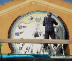 While Díaz selects images, decides on which media to use where, cuts the tiles, mixes the cemento cola mortar [a mixture that includes a glue, made especially for tilework] to affix the materials to the walls, layers it on with a simple kitchen knife, and places the pieces, his wife Asunción has been a faithful and supportive partner in this project from the beginning. She claims to aid him no further than small assistance such cleaning the excess mortar off of the pieces once they have been affixed, but Díaz counts her as a wise and exacting critic. “She’s tough, but she’s never wrong,” he says; in turn, she complements him by saying that he has boundless energy, and, even more endearing to her, that he is constantly pleasantly surprised by the work he produces: he never says that he’s disappointed in the final results, only that he’s amazed that it turned out even better than he had hoped.