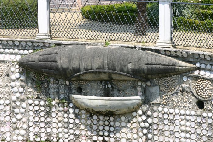 Design of such architectural elements as walls, walkways, and banisters tended to be in the style borrowed from the assortment of architectural idioms being explored in the Americas, rather capriciously combined with elements of indigenous architectural traditions, resulting in an eccentric and fanciful display. Certain whimsical ornamental components found in O Pasatempo are also extant in other gardens built during this time period, such as the ornamental use of shells, murals, and mosaics; tree trunks represented in concrete (both as supports and serving a purely decorative function); and artificial grottoes with stalactites and stalagmites. It appears that the murals, sculptures, fountains, or grottoes were developed on a rather ad-hoc, additive basis, rather than being planned out and preconceived as a totality in advance, although it was visualized from the beginning as an encyclopedic park.