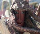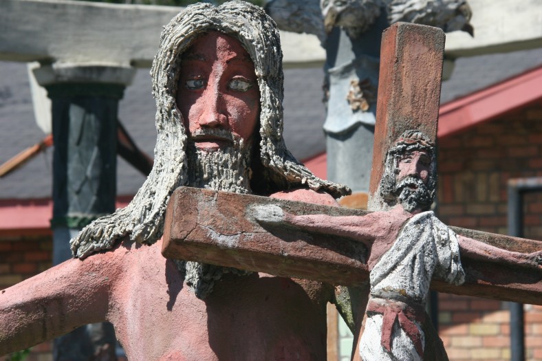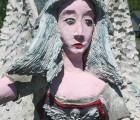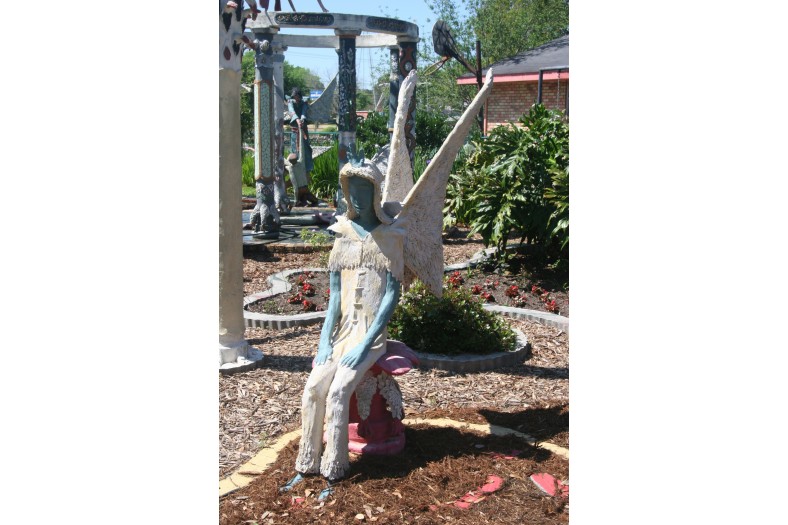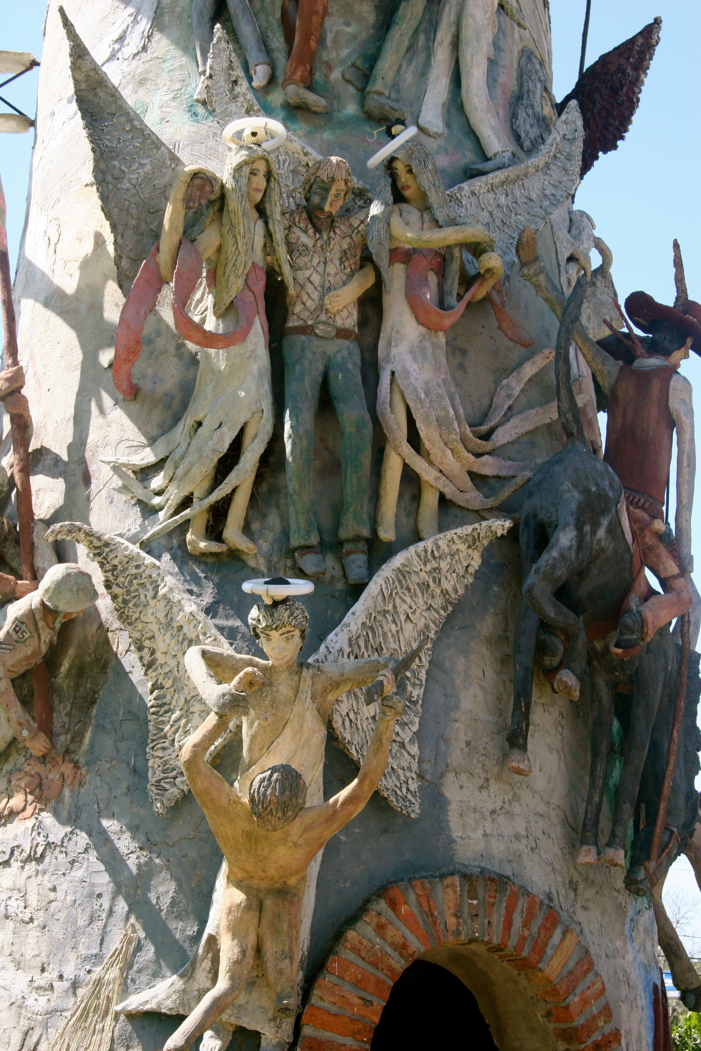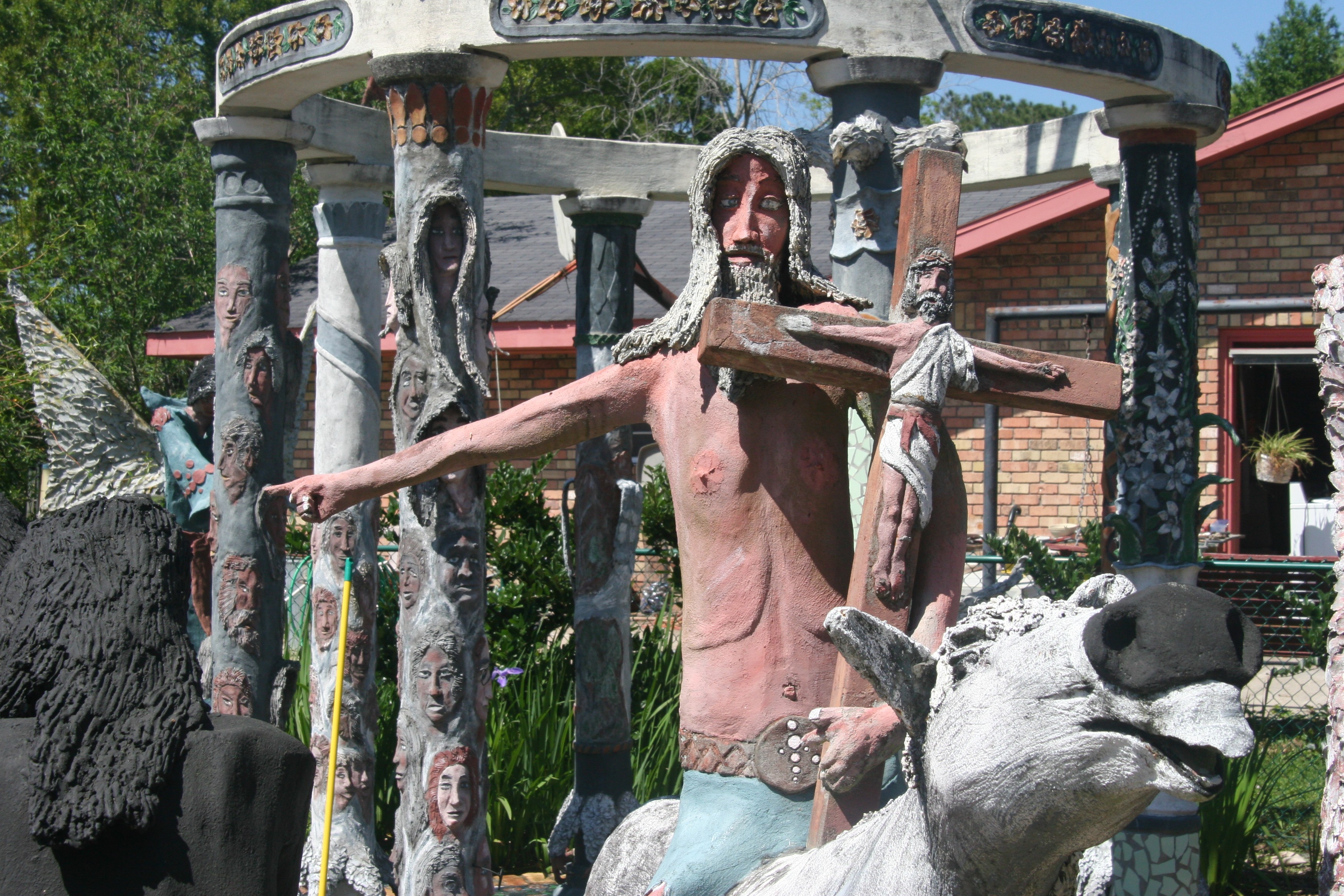 Throughout the 1990s, Hill created a densely symbolic environment populated by angels, multiple self-portraits, eagles, sinners, cowboys, and maidens. All are roughly life-sized, thin hollow figures with attenuated limbs. Hill’s tools were common: he used a fork and spoon to carve surface detail into a concrete mortar formed over wire mesh and rebar. A forty-five-foot tall brick lighthouse, with figures clinging to its exterior in a semi-narrative scene, forms the centerpiece to Hill’s Garden. He wired circular incandescent bulbs as flying angels’ haloes, and a concrete waterfall on the bayou side of the lighthouse was outfitted with plumbing; it flowed with real water when connected to a garden hose. The reappearance of Hill’s self-portrait in various guises – on horseback, fallen onto the lap of an angel, supporting an alighting eagle, with bleeding heart, and once, with a divided face painted black and white – suggests a personal narrative layered atop Christian symbolism of apocalypse, judgment, and redemption. Dr. Deborah Cibelli, Professor of Art History at Nicholls State University (NSU) in nearby Thibodaux, has presented observations on Hill’s religious iconography, drawing comparisons to Renaissance themes.