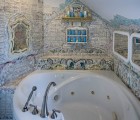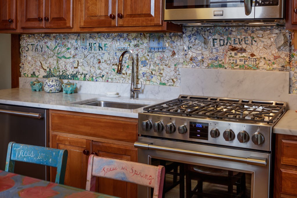 A mosaic covering the wall above the kitchen counter re-assembles the childhood family home over the stove and re-states part of her father’s sentiment: “STAY HERE FOREVER.” Physical remnants enhance the emotional connection to past times and places: for example, Steve’s army shirt and letters home from Vietnam are incorporated into two wall-hung artworks prominently displayed on the first floor. After her mother’s death in 2002, her treasured powder blue Estée Lauder perfume bottle collection— surrounded by ceramic imprints from her letters and private diaries— became the centerpiece of a new mosaic in the upstairs master bath. Lindsey recalls: