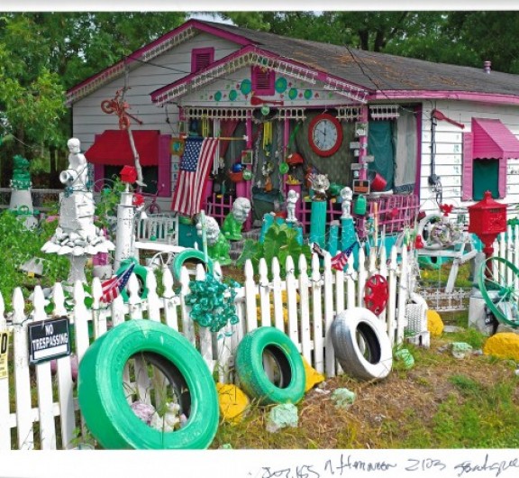 Hull is frustrated that so many garbage trucks pass by her home with perfectly good raw material for her art scattered through their cargos. These days, with her mobility limited by ill health, visitors bring her much of her supplies. But not just anything will do. Once, when she was hospitalized, a couple brought her a batch of dried gourds—so far, so good—but offered her paints in hues far more subdued than the bright colors she favors. To her, those colors looked “as dead as anybody that ever died.” Indeed, if she employs a mild color like forest green, it is only to set off some hot pink dots.