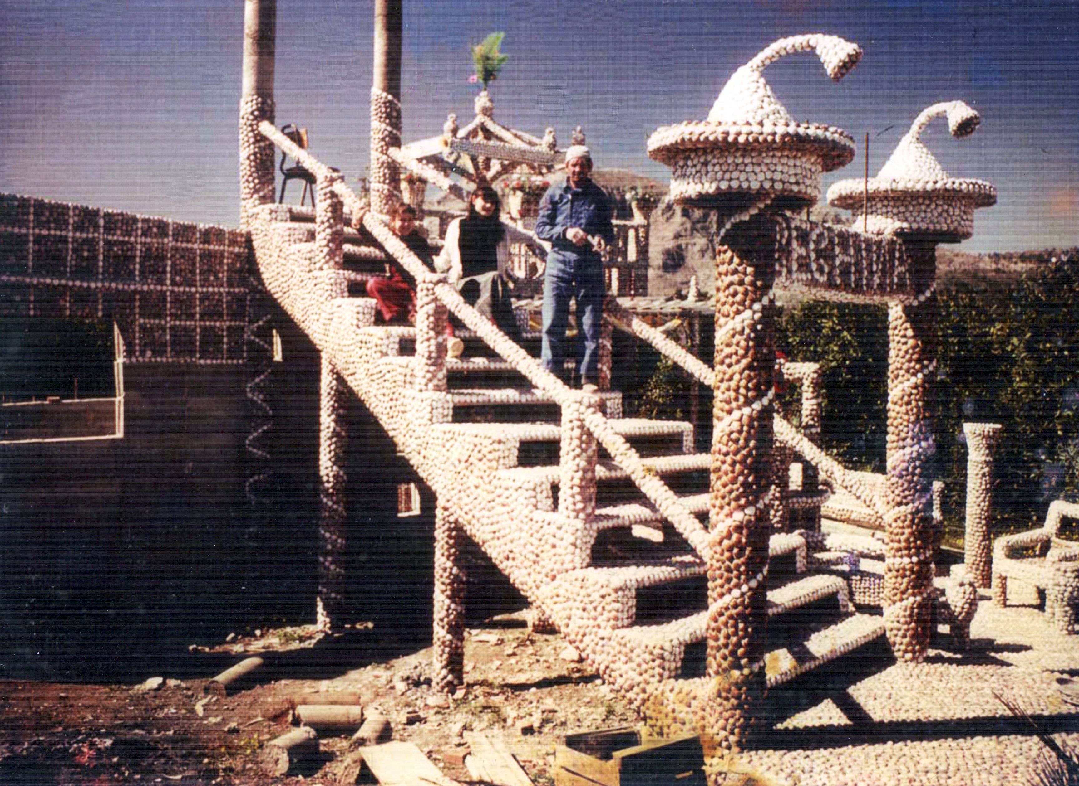 In 1974, Palomares had an accident with his motor scooter that left him without the full use of one leg; the government classified him as an invalid and paid him a disability pension, thereby giving him the financial ability to build the elaborate art environment that he would eventually construct. He chose as his site the land inherited from his parents, which had by then been significantly reduced to less than two-thirds of an acre due to the construction of the AP-7 toll road, which bordered and had appropriated their property. At first, his idea had only been to construct a little house in which to keep his tools for cultivating the small plot of land that remained, but then he decided to decorate it as well. He had never shown any interest in the arts before—and certainly, given his limited education, he would have not learned about art in school—nor had he ever spoken about building any elaborate or fantasy constructions. But his daughter Margarita recalls that after the accident he started making sketches and he immediately went to work to realize his visions.