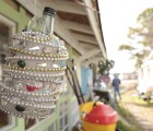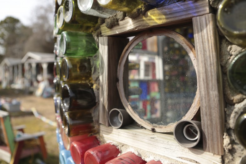 Paulsen also uses bottles in her construction, and has created a bottle house in which the colorful containers from cologne, condiments, wine and beer, cologne, nail polish, and peanut butter are inlaid horizontally into the walls. The first bottle was added on October 5, 2008 and the 8000th on February 9th that following year. There are also freestanding vertical sculptures, planters, a well, and a ship-like form in the garden that is created from bottles, again referencing the sea and its importance to the local residents.