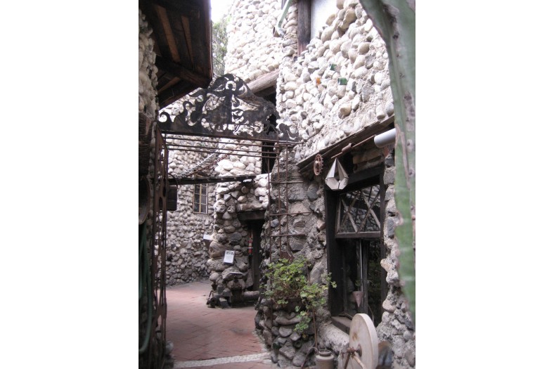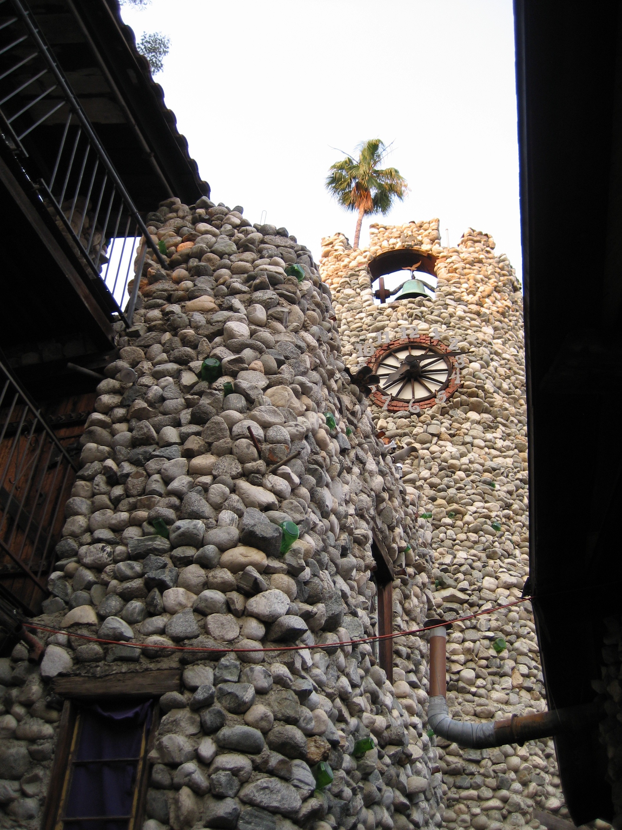 The Castle was built on a 124-foot diameter irrigation reservoir that was completed in 1910. When Castle construction began in 1968, the reservoir provided a ready-made concrete foundation. This base and the 12-foot walls established the organizing form for the complex. Capped with battlements, the Castle walls are built primarily from stream rocks and slabs of recycled granite set in cement mortar. With the original reservoir walls serving as a base, the Castle walls, buildings, and towers were constructed over time, to form a continuous, self-contained townscape. In some places, the original reservoir walls remain visible. Embedded in the mortar of the Castle walls are many recycled and found objects and curios, such as bottles, household items, and appliances, as well as portions of bicycles and motorcycles.
