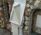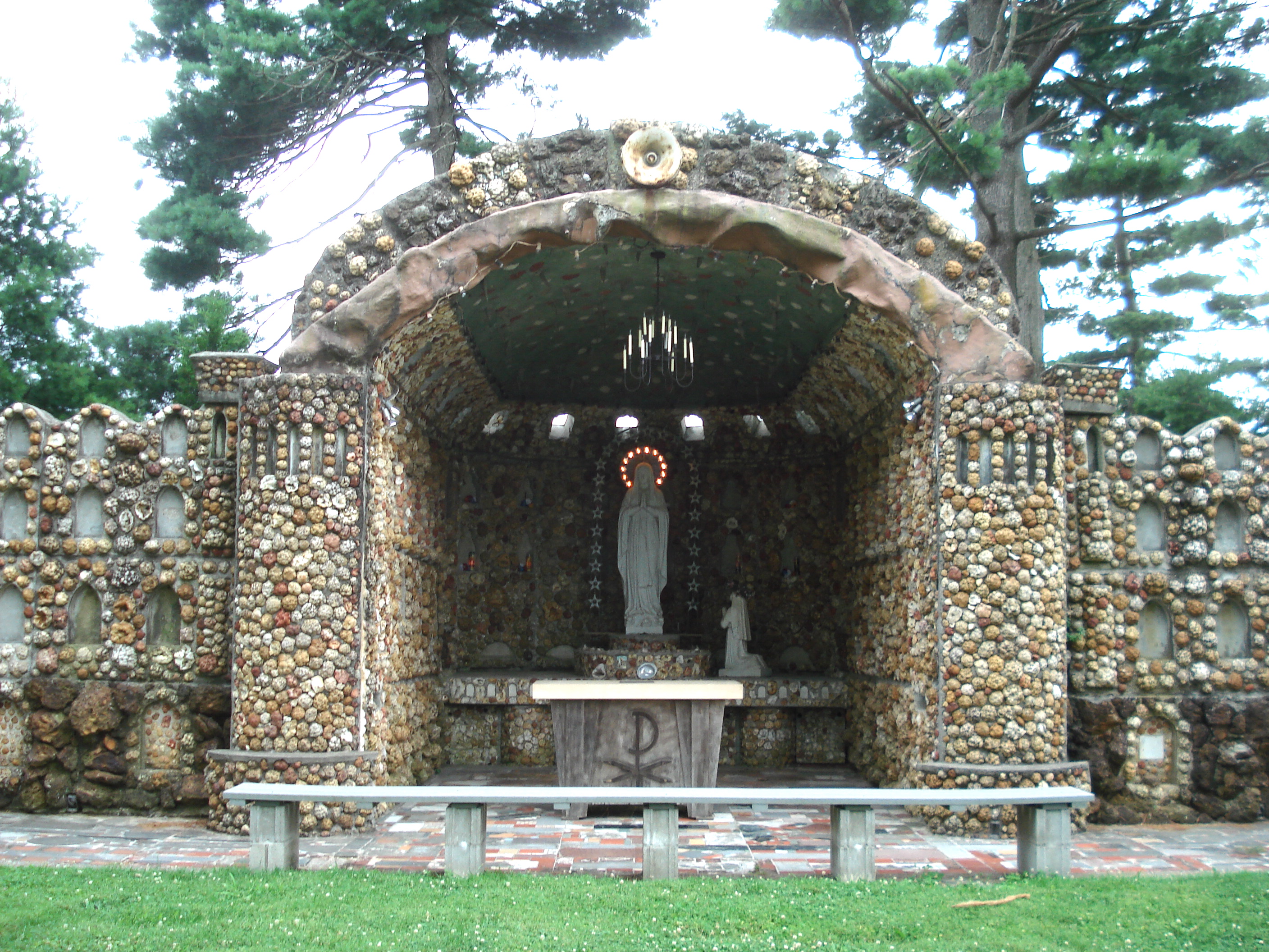 Ottavi made use of local materials, particularly the local geode stones that were abundant in Heltonville, some sixty miles northeast of Jasper (capital of the so-called Geode Belt). These stones, with their crystal centers, were a popular material for building and landscaping from the nineteenth century on, and so it was not seen as unusual for Ottavi to set these rocks into a concrete mortar. He interspersed them with found objects, marble, seashells, religious artifacts, and limestone. Life-size religious sculptures were imported directly from Carrara, Italy’s famous marble quarries to grace the major grotto components. Construction of the site took place between 1960 and 1970.