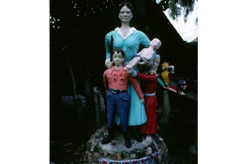 For the next fifteen years, Ehn constructed the cemetery figures and another series he called the “Old West Mooseum.” A friend occasionally helped with signage, but Ehn built the sculptures alone. His “Boot Hill Cemetery” was intended as a family memorial: he built the faces of his statues around life masks he made of family members. The characters they portrayed were from favorite folksongs and stories. A tombstone epitaph described the alleged demise of each sculpted character.