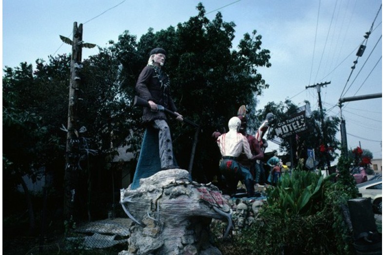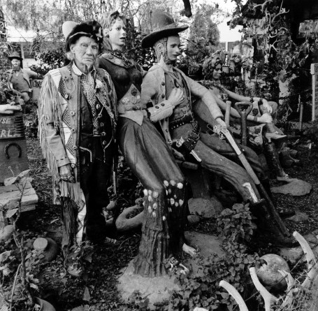 After watching sculptor Claude Bell at work at Knott’s Berry Farm, a Buena Park, California theme park, Ehn hired the artist in 1951 to portray him as a trapper in a giant concrete sculpture. After three days, Ehn felt he had learned all the techniques he needed to work alone. Working in the front yard of his motel, he began building a series of sculptures he later called “Boot Hill Cemetery.” Each sculpture began with a strong wire armature he covered with cement, often adding a final application of brightly colored paint.