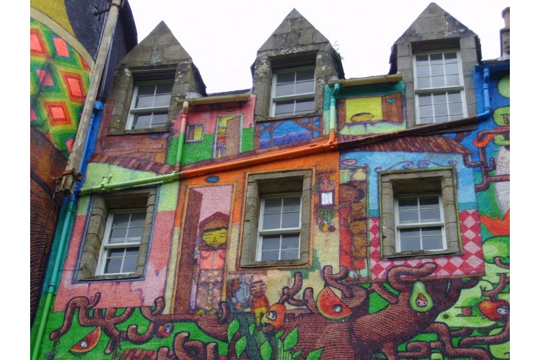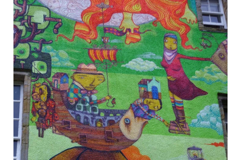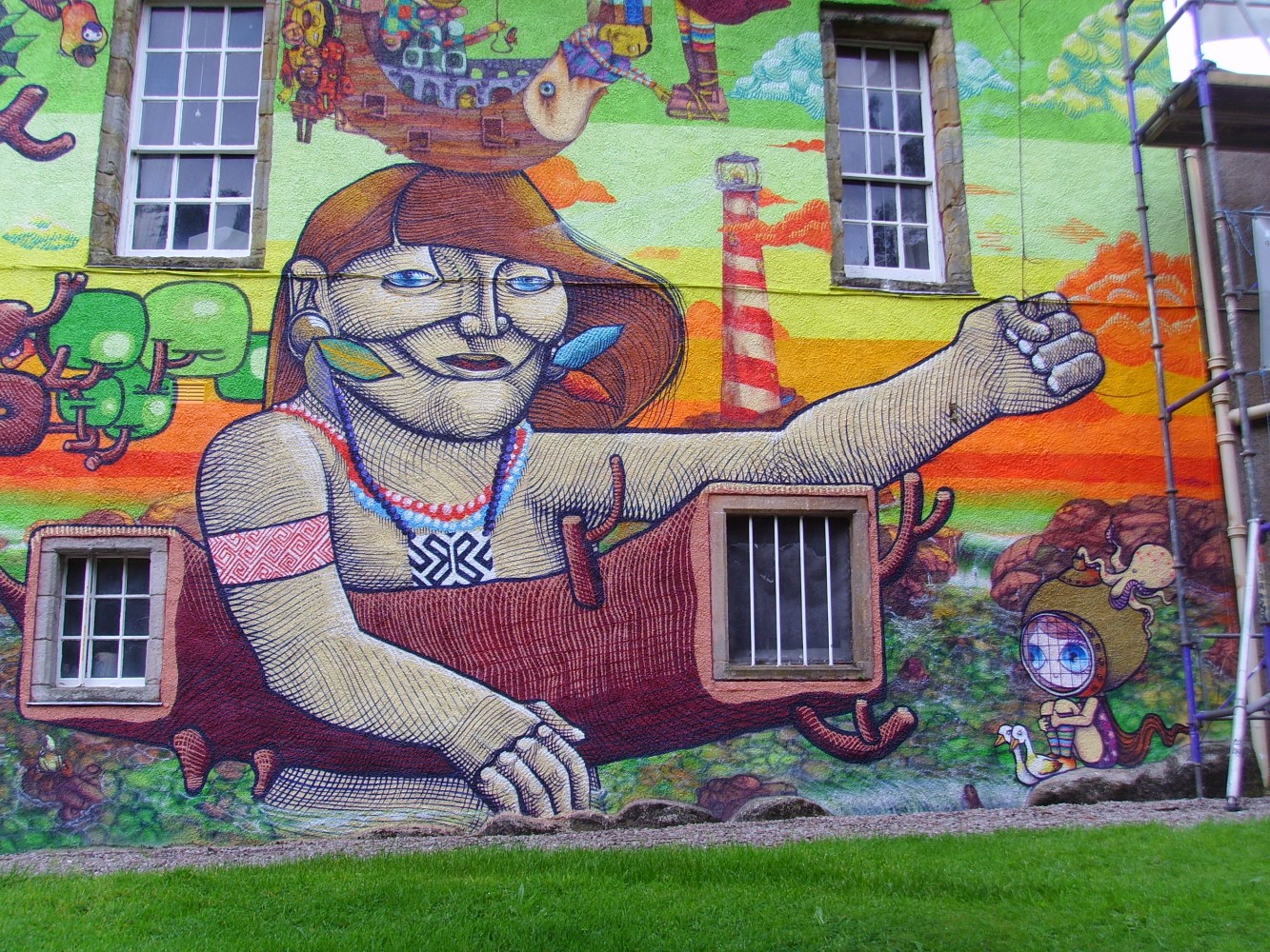 The Kelburn Castle graffiti project began in 2007 and the artists stayed in residence for a couple of weeks as they emptied some 1500 aerosol cans, at a cost of £20,000. Their unique style, readily apparent in their work on the Castle project, includes the portrayal of quirky human figures, which are usually oblong, with round, often yellow-colored heads. In general the scenes they create in their pieces evoke a fairytale-like atmosphere, although specific items on the Kelburn Castle mural have a similarity with those painted by the16th-century Flemish painter Hieronymus Bosch.