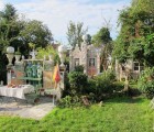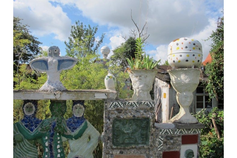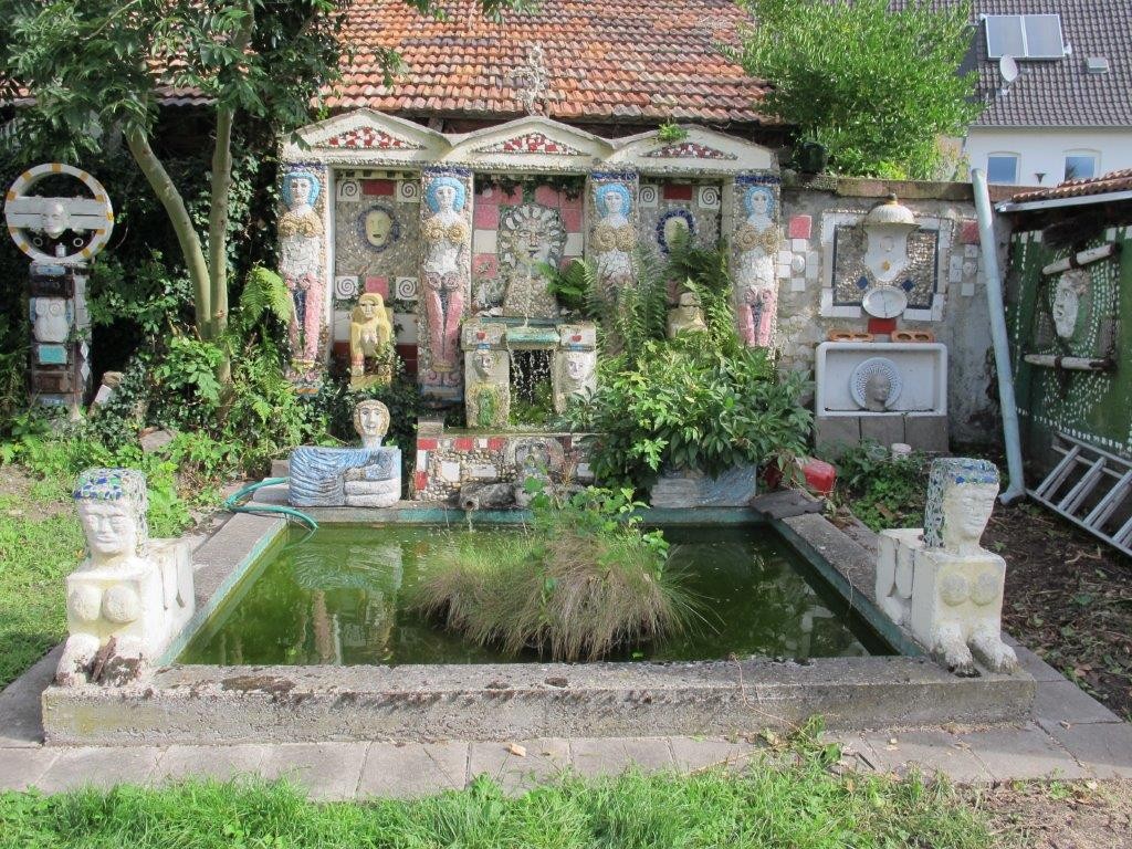 Around 1985, influenced by the work of such artists, Culmann began adding artworks to the garden behind his own house, and over the past thirty years this site has developed to include decorated painted walls (sometimes including bas-relief sculptures), fountains, monuments, and numerous sculptures, many decorated with colored plates, mosaics, and bathroom tiles: he transformed the site into what he calls his Paradise Garden. Specific works include a Roman fountain, an Egyptian fountain with the great sphinx, and a Greek fountain featuring Ariadne, wife of the wine god Dionysius. There is also a temple dedicated to the Three Graces, a House of Secrets, an overgrown pirate tower, Robinson Crusoe’s hut, and more. On a street corner near his house, he transformed a brick wall along the street into a spectacular, colorful mosaic, fronted by a concrete bench painted with huge eyes. While his aesthetic seems to fit well within the range of the visionary and fantastic, Culmann also describes himself as a “militant surrealist.