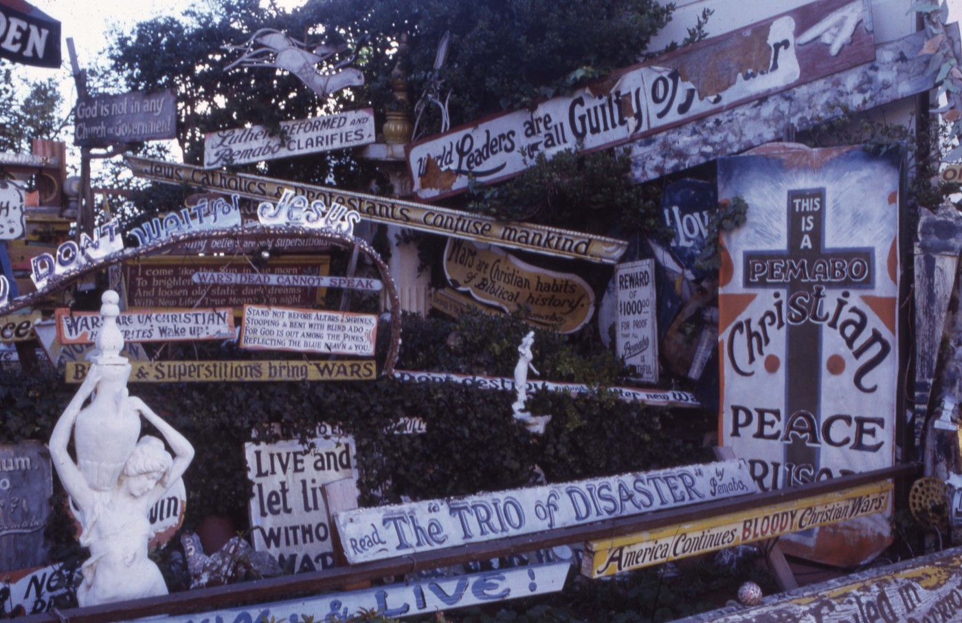 Peter Mason Bond was born in Australia and came to San Francisco in 1905. A retired sign painter turned artist-philosopher, Bond converted his San Francisco home into the Pemabo Peace Garden in his passionate search for world peace. Hundreds of hand-painted signs expressed his beliefs in the hypocrisy of the academic, political, and theological worlds, interspersed with a myriad of colorful scavenged materials. He also made oil paintings. There is a photograph of the site and a painting illustrated in Twentieth Century American Folk Art and Artists by Hemphill and Weisman. He was included in the exhibitions "Cat and a Ball on a Waterfall" and "Pioneers in Paradise." The Garden was dismantled after his death and most of the works destroyed.