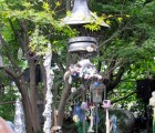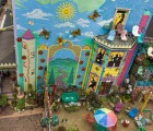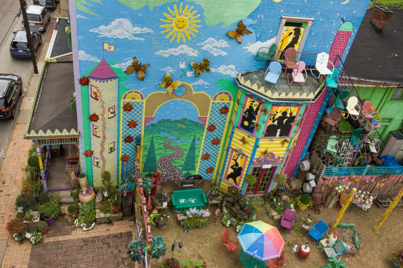 Given his background, while Gilson says that he knew nothing about art or gardening, he did know how to stretch a penny, and he understood the value of recycling the cast-offs he’d find on corners and neighborhood alleyways. He used his tips to buy cans of returned paint in bright colors or planters with cracks and chips in order to supplement the found objects that he began to install in the courtyard and on the façades of the building. On one side he painted a 40-foot high mural of mountains, waterfalls, and a golden castle, adorned with cutout ladybugs and butterflies. In another area he mapped out the city of Pittsburgh itself, extending far out from downtown to showcase his own neighborhood. He wants people to visit, and to understand the diversity that makes up his city. He adorned the streets on the map with miniature models of buildings and the local at1tractions.