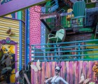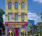 The buildings and courtyard are decorated with constructed and recuperated butterflies, swans, miniature lobsters and dinosaurs, pink plastic flamingoes and green alligators, mannequin heads, metal flowers, tiki mugs, metal porch chairs, and more. In the courtyard they are placed among low rock fences and all kinds of gardens, including succulents, firs, and flowers, set into sewer pipe planters and other recycled containers. Street and advertising signs and animal cut-outs are affixed to the upper levels of the side façade, and all windows and doors are limned with rainbow colors. Polka dots, giant tropical leaves, and stripes are standard painting treatments, and silhouetted figures of dancers and musicians make it look like as if there is a constant party going on inside; their be-bopping movements are echoed in life-size figures painted in vibrant colors onto the surrounding wooden fences.