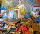 Though Ron Gittins was well-known for his creative proclivities and was often seen about town wearing elaborate, homemade costumes and pushing a stroller filled with art materials or a life-sized papier-mâché sculpture of Cleopatra, neither his community nor his family knew the extent of the work he had done to turn his Wirral flat into an immersive art environment. Upon his death in September 2019, people entered his home for the first time in years to discover expansive murals featuring Greco-Roman and Egyptian characters and underwater scenes, painted canvases on easels and propped against walls, papier-mâché sculptures, piles of found objects and other materials for future art projects, and the most stunning works–fireplaces built out into enormous, three-dimensional sculptures like a roaring lion, a bull’s head, and a temple.