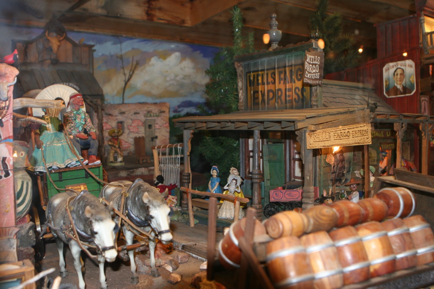 Around 1967 Ward, his wife Sandra and their son Jason and daughter Tanya (the writer who years later published the memoir Leaving Tinkertown [University of New Mexico Press, 2013]) moved to a five-room cabin on the road to the Sandia Crest. Ward continued to paint for carnivals as well as for local businesses; several paintings remain extant at the Mine Shaft Tavern/Theatre in Madrid, New Mexico, among many others in the area. He also continued to carve, over the next 35-40 years creating thousands of figures as well as the context in which his figures would have lived: drinkers in a saloon, locals in a Native American trading post, buyers and sellers in a general store. There was also a hotel, a pharmacy, and a blacksmith shop. The faces of his tiny whittled people were expressive, and the background was always intricately detailed.