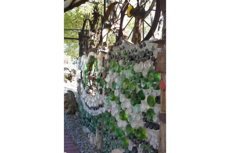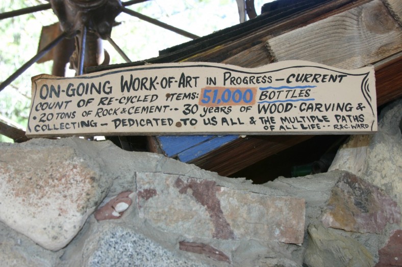 Around 1983, Ward and his second wife Carla – who he had met and married in 1980 – decided to open Tinkertown as an attraction behind the family home. As a sign on the property reads, “Tinkertown was begun as a hobby in 1962. It was not intended as a public display, until your interest helped build ‘our museum!’” Ultimately 22 rambling, winding, organically-shaped, maze-like, and multi-leveled rooms built out of cemented rocks and found objects would house the miniature scenes. The carvings that he had begun as his “Folk Art Village” were enhanced – and in some instances, even overshadowed – with innumerable found objects, as Ward was an insatiable collector. He remained particularly interested in the culture and legends of the Old West, and his finds included old harnesses, tinware, stoves, farm equipment, weathered wood, wagon wheels, old signs, vintage toys, tools, arcade games, wedding cake couples, and much more. A 35-foot-long boat that Carla’s brother Fred sailed around the world over ten years complements a 1940s circus exhibition, the “Boot Hill Cemetery,” and an animated western village that extends for over sixty feet. Feeding quarters into the displays animates Ward’s dioramas, including god and the devil fighting for souls while being serenaded by a skeletal mariachi band, the old-time fortune teller Esmeralda, the one-man-band Otto, and many others. Bottles recuperated from the ditches and the dump became so numerous that bottle fences turned into bottle walls, and were ultimately incorporated into every part of the museum, providing a sense of visual continuity throughout and around the property. The most recent count is 51,000 bottles of all shapes, colors, and sizes; the structures also include “20 tons of rock & cement..30 years of wood-carving & collecting [and are] dedicated to us all & the multiple paths of all life.” The Tinkertown Museum was constantly a work in process.
