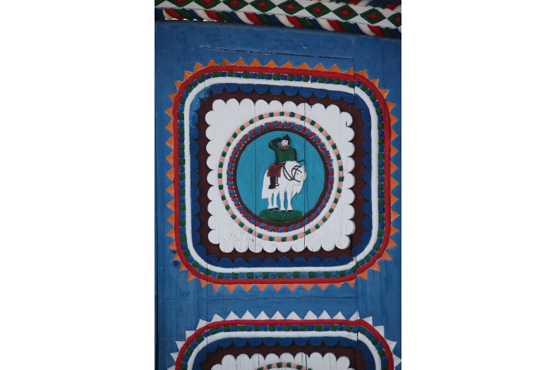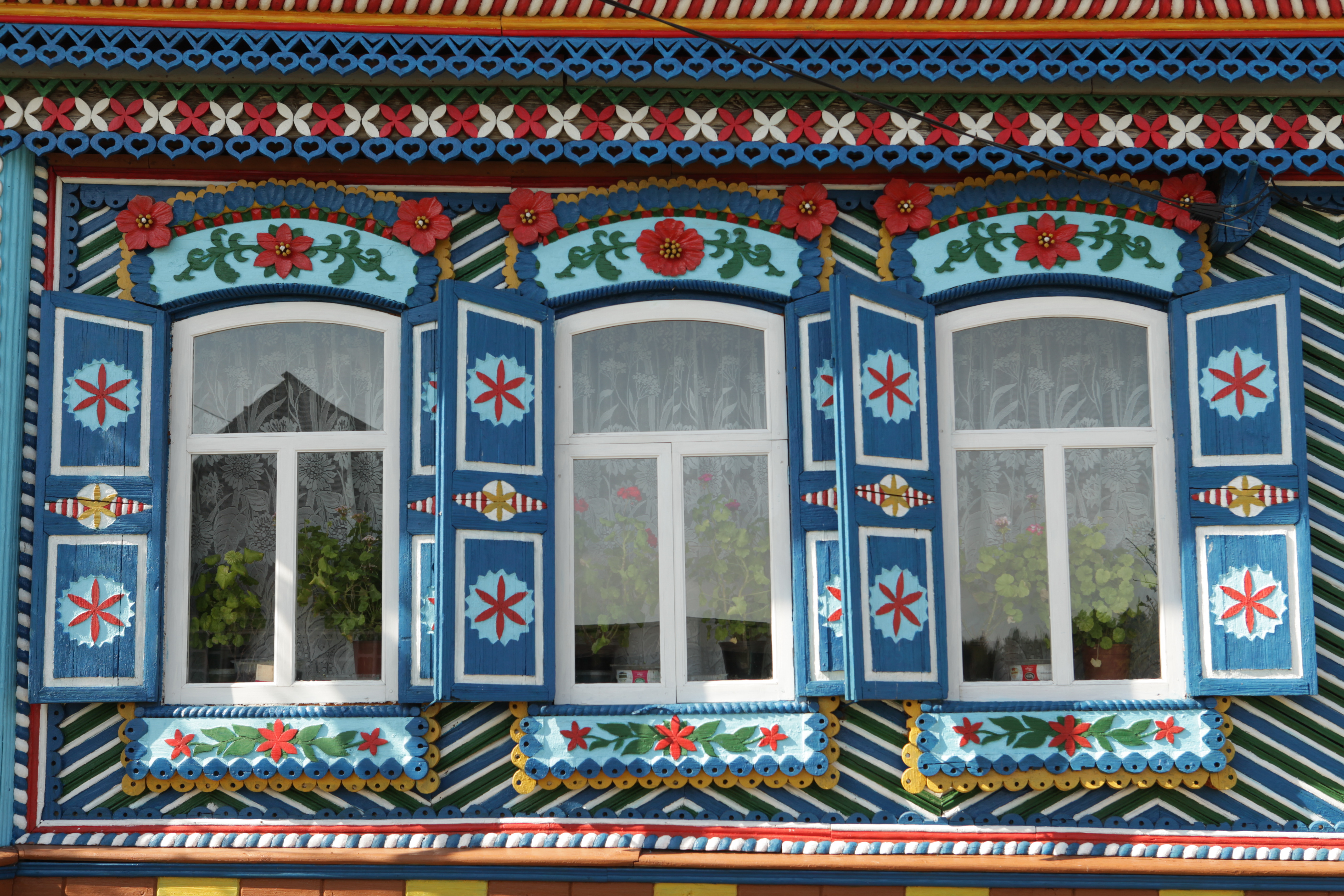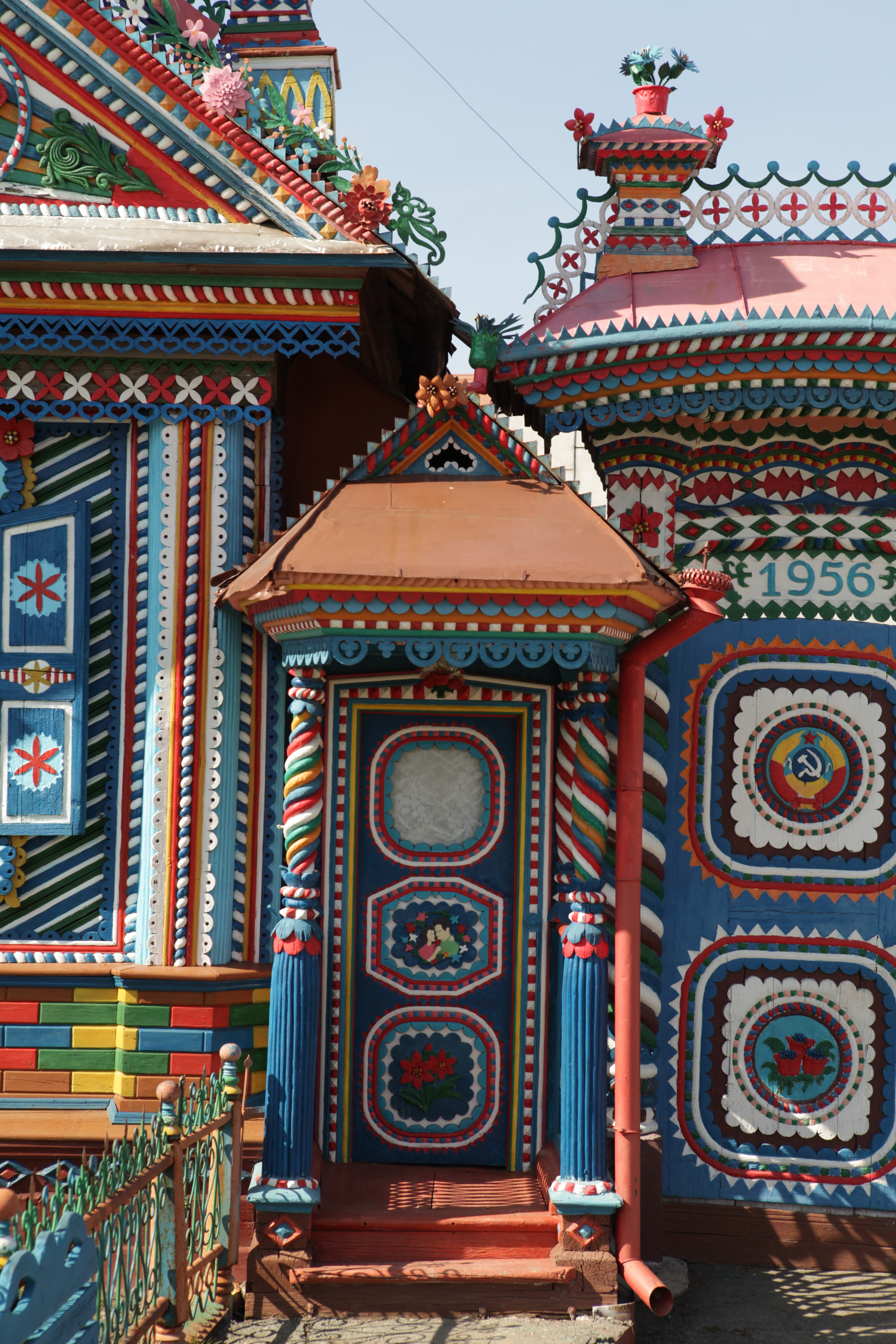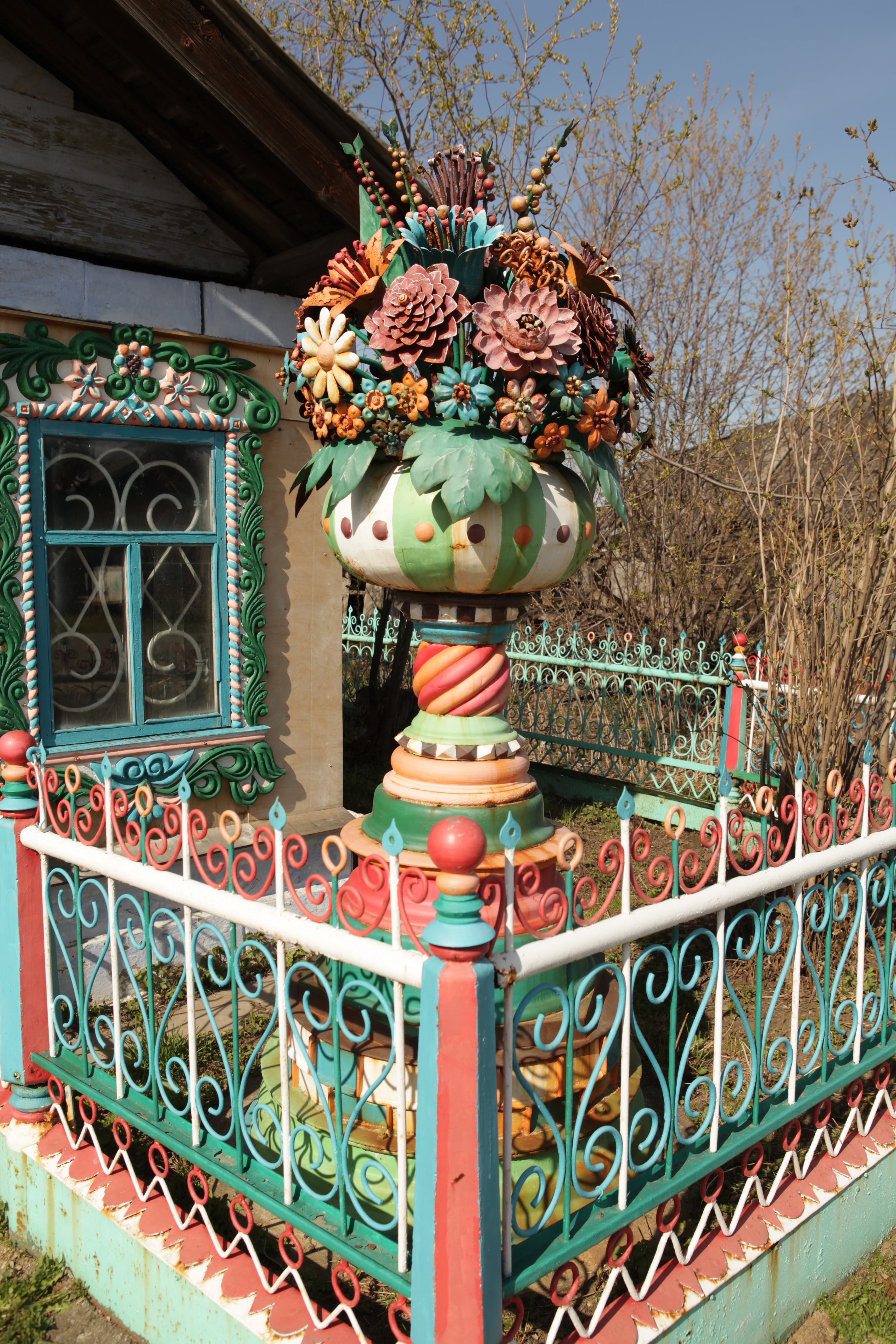 Kirillov used wood and metal as his basic materials. From wood he created a large variety of carved ornaments, which he added to the façade in symmetrical, colorfully painted arrangements. He also assembled quadrangular decorations consisting of stacked layers that he added to the ridge of the roof. Other freestanding elements include objects such as a life-size vase with an arrangement of flowers, displayed near the entrance to the property.