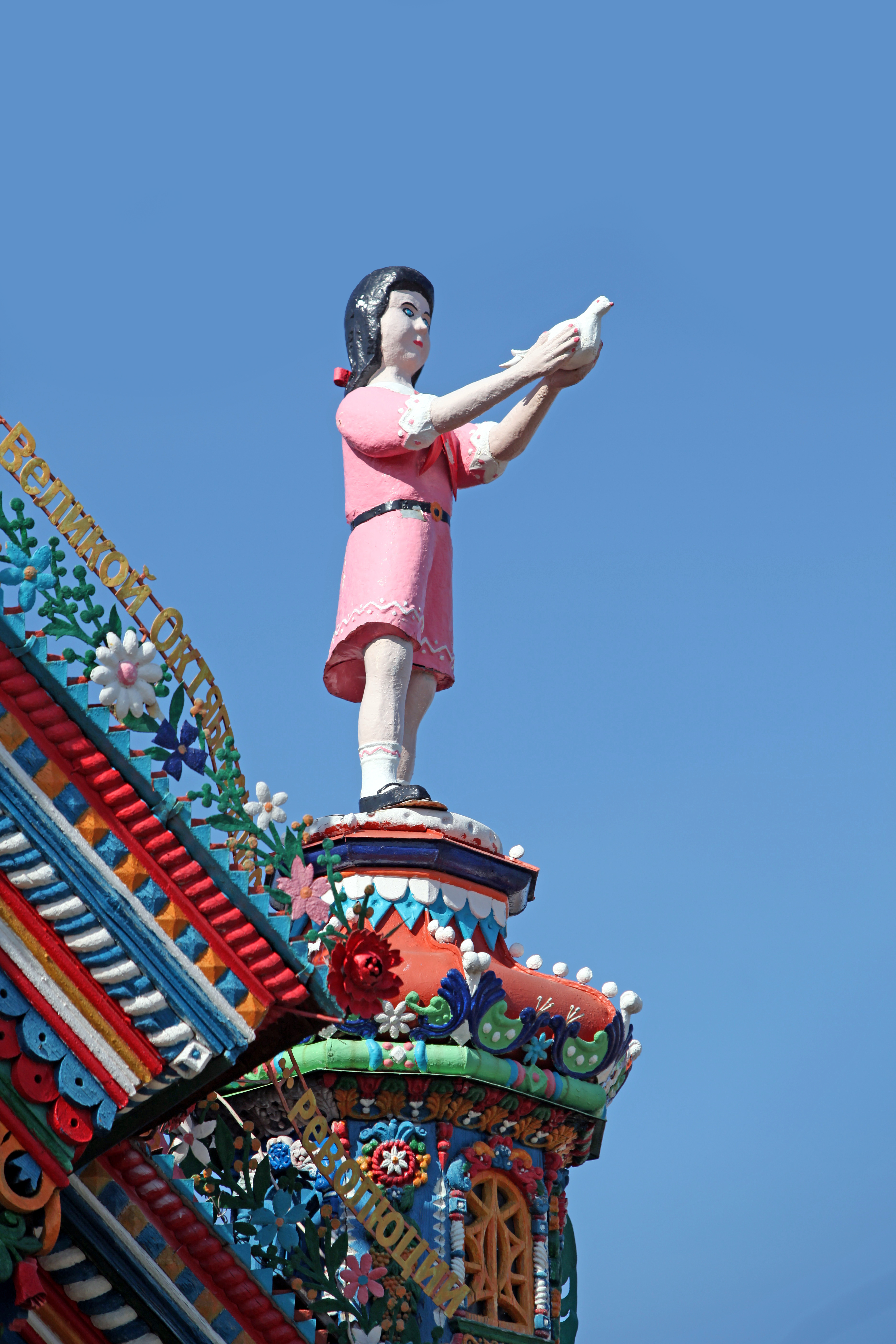 These sculptures mainly depict young people (Pioneers of the Russian youth movement), who hold up signs with texts or release doves. In the middle a youngster rides a rearing horse as he salutes with a raised arm. Although the aesthetic of the sculptures reflects the period of their creation during the years that the communist regime was dominant, the expression of the sculpted figures and comparable manifestations can be described as affectionately and enthusiastic, rather than propagandistic. This is also reflected in inscriptions on the house; examples read: “Letite golubi, letite. Dlya vas nigde pregrady (Fly pigeons, fly. For you, there are no obstacles)” or “Pust' vsegda budet mama, pust' vsegda budet mir (Let there always be mothers, let there always be peace).”