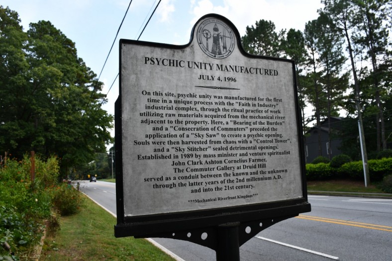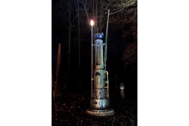 Secondary to the landscape is the sculptural environment The Mechanical Riverfront Kingdom, “consisting of all interior and exterior symbolic structures and artifacts (physical, conceptual, audible, visual, digital, etc.) created on Druid Hill, including but not limited to the assimilated and re-purposed Commuter Gallery,” says Ashton. The site consists of sprawling back and front yards populated with sculptural installations like “The Battle of Druid Hill,” an installation of 13 metal figures. The “battle” is described in a placard installed by Ashton on site: