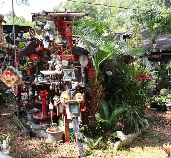 Ashton describes his oeuvre–which includes hundreds of discrete sculptural objects–as examining “the two most powerful forces in the history of human culture, God and Capitalism” as well as “the nature of faith, power, value systems, and systems of belief.” Ashton’s sculpture and integrated performance piece serve as an intentional disruption to the normal work day of the folks driving by and emphatically infuse the prosaic act of commuting with creative energy. Ashton continues to create in the studio and welcomes visitors to his home every day from 10am to 5pm. He can be contacted at clark@druidhill.org.