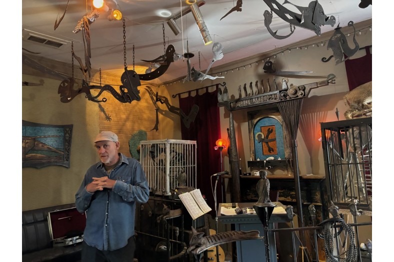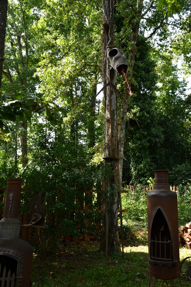 If you find yourself stuck in traffic on North Druid Hills Road in Decatur, Georgia (a small city in the Atlanta metropolitan area), you might get lucky enough to have sculptor and performance artist Clark Ashton give you “the day off.” Ashton, born in Augusta, Georgia in 1958, learned to weld in high school and, though he had no formal art training, began wielding that skill to create sculpture in 1989. To supplement his artistic practice, Ashton enrolled at Georgia State University where he received a B.A. in anthropology followed by an M.F.A. in sculpture. He went on to teach sculpture at The Georgia Institute of Technology, The University of Tennessee at Knoxville, and The State University of West Georgia. In addition to creating sculpture, Ashton also produces films (Mechanical Riverfront Kingdom which premiered at DOCUTAH in 2015 and The Ballad of Druid Hill which won Best Short Music Documentary at the 2019 Barebones International Film Festival), paints, and performs with the band The BooHoo Ramblers.