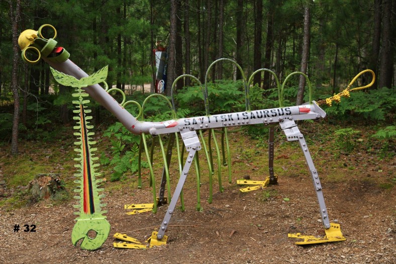 But he couldn’t stop making his sculptures, so in 2003 he found a 37-acre parcel of land for sale along the highway, and refinanced his house to purchase the property. This site, to which he moved all of his sculpture, is located across the street from Lake Superior and alongside winter snowmobile trail 417, approximately 15 miles east of Marquette. There, he created his self-named park: the large painted entrance sign welcomes visitors to see his “Junkyard Art.” Using a variety of scrap materials, he has welded and pieced together a wide variety of found objects to create whimsical creatures – some brightly painted (by his mother) and others in their natural state of stainless steel or mild steel – who straddle fallen logs or peek around trees.