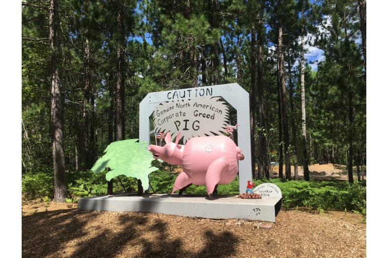 Among the humorous works are several that have a more political tone; one, with an American flag, displays the words “Economy/Jobs, Health Care, Education, Iraq, Taxes…;” there is also a large pink pig – a “Genuine North American Corporate Greed Pig” – juxtaposed against the “tiny American worker.” This piece was created at the time of the Enron scandal when hundreds of workers lost their life savings as a result of the financial misdealing of corporate executives. Other sober works include a memorial to the victims of 9-11, and tributes to the U.S. Marines, Michigan loggers, and Union Ironworkers.